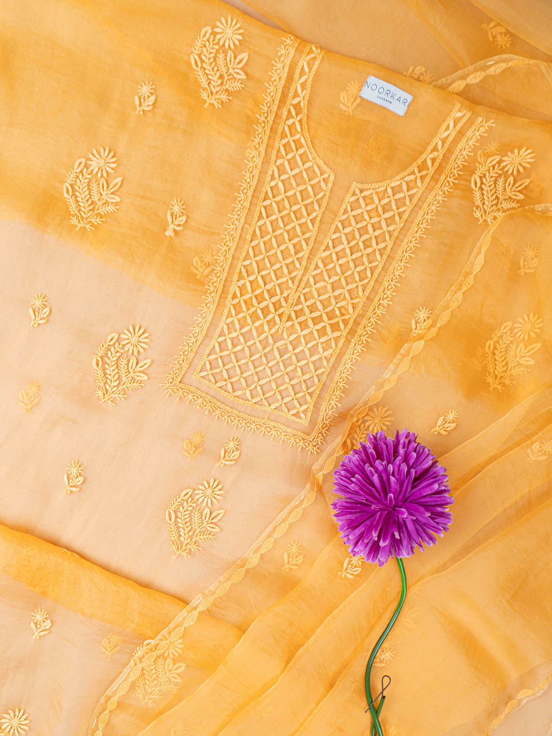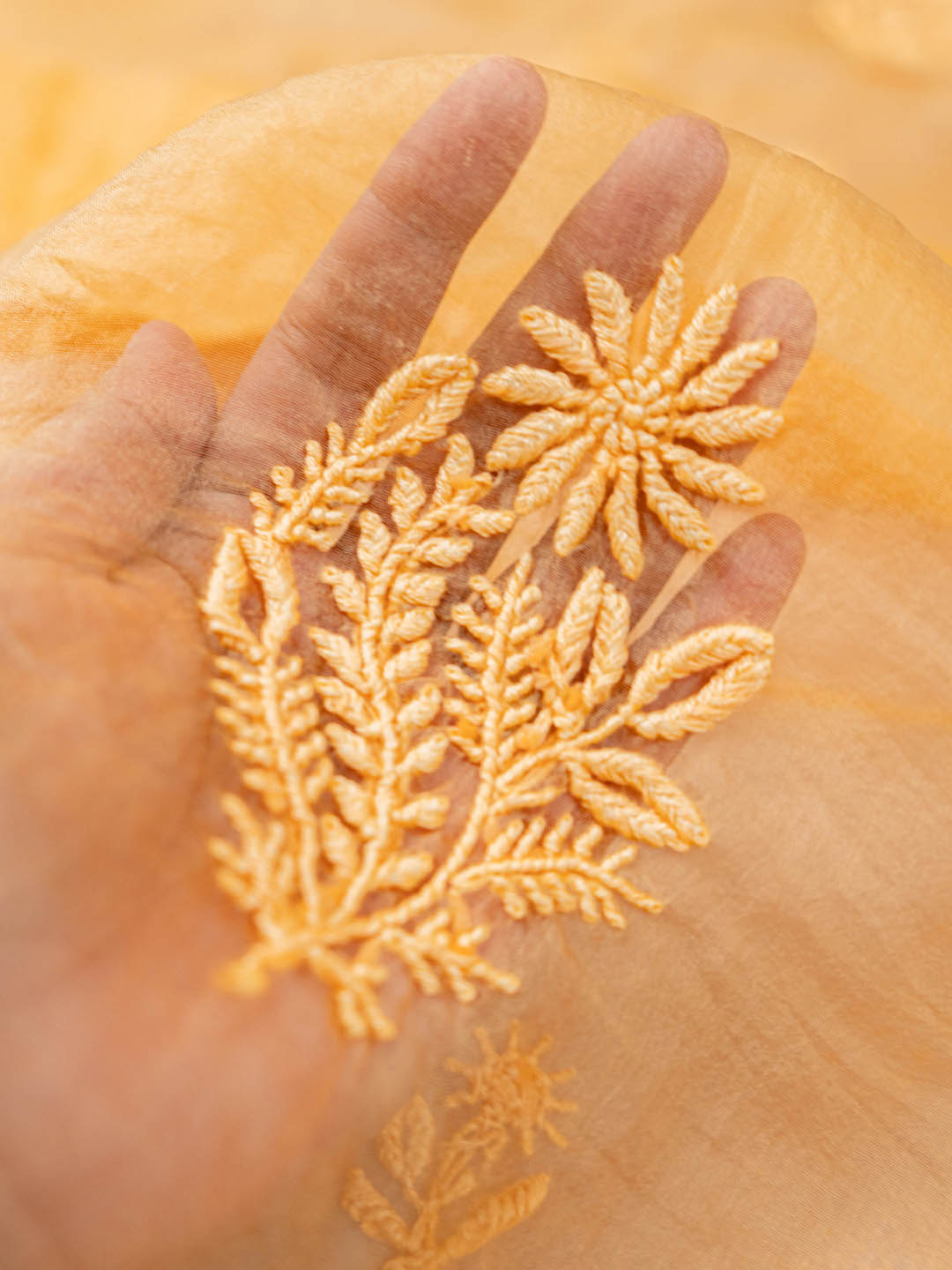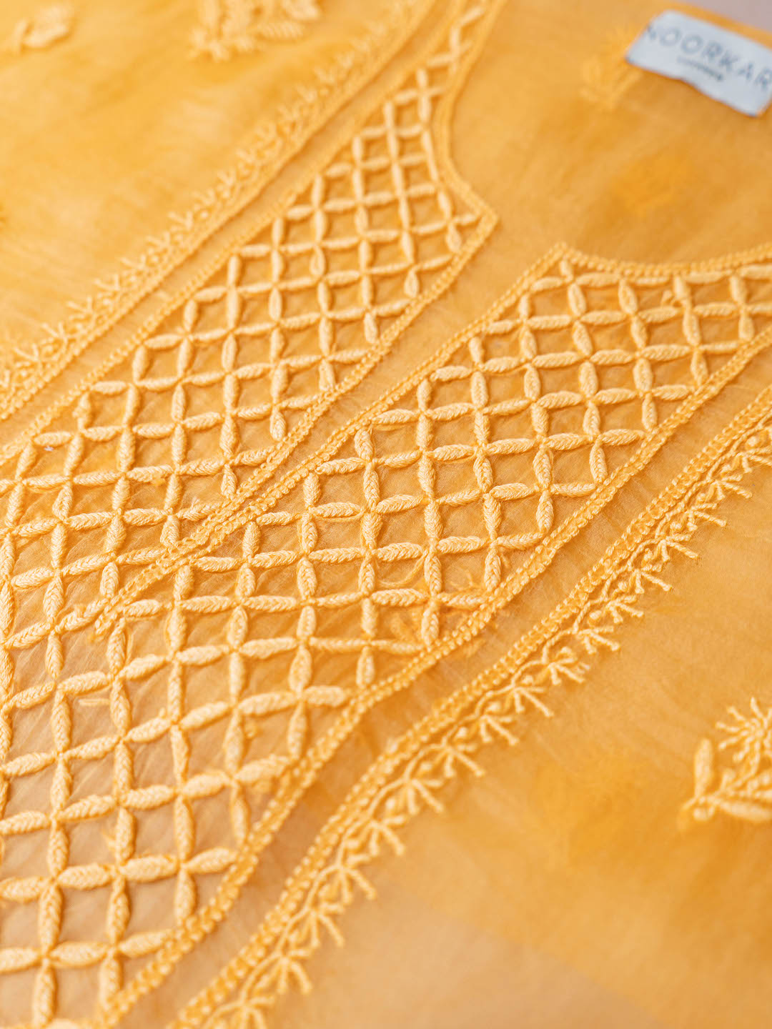Chikankari is an Art of delicate handwork of Lucknow. It is a handcrafted process where the wooden blocks are manually carved in various designs, and the natural stew for printing is prepared, and printed on the cloth. The chikankari craftsmen then use ten ary of the needlecraft embroidery, and perform the needlework artistically. There are 32 stitches of chikankari broadly classified into Raised stitch, Embossed and Flat stitch.