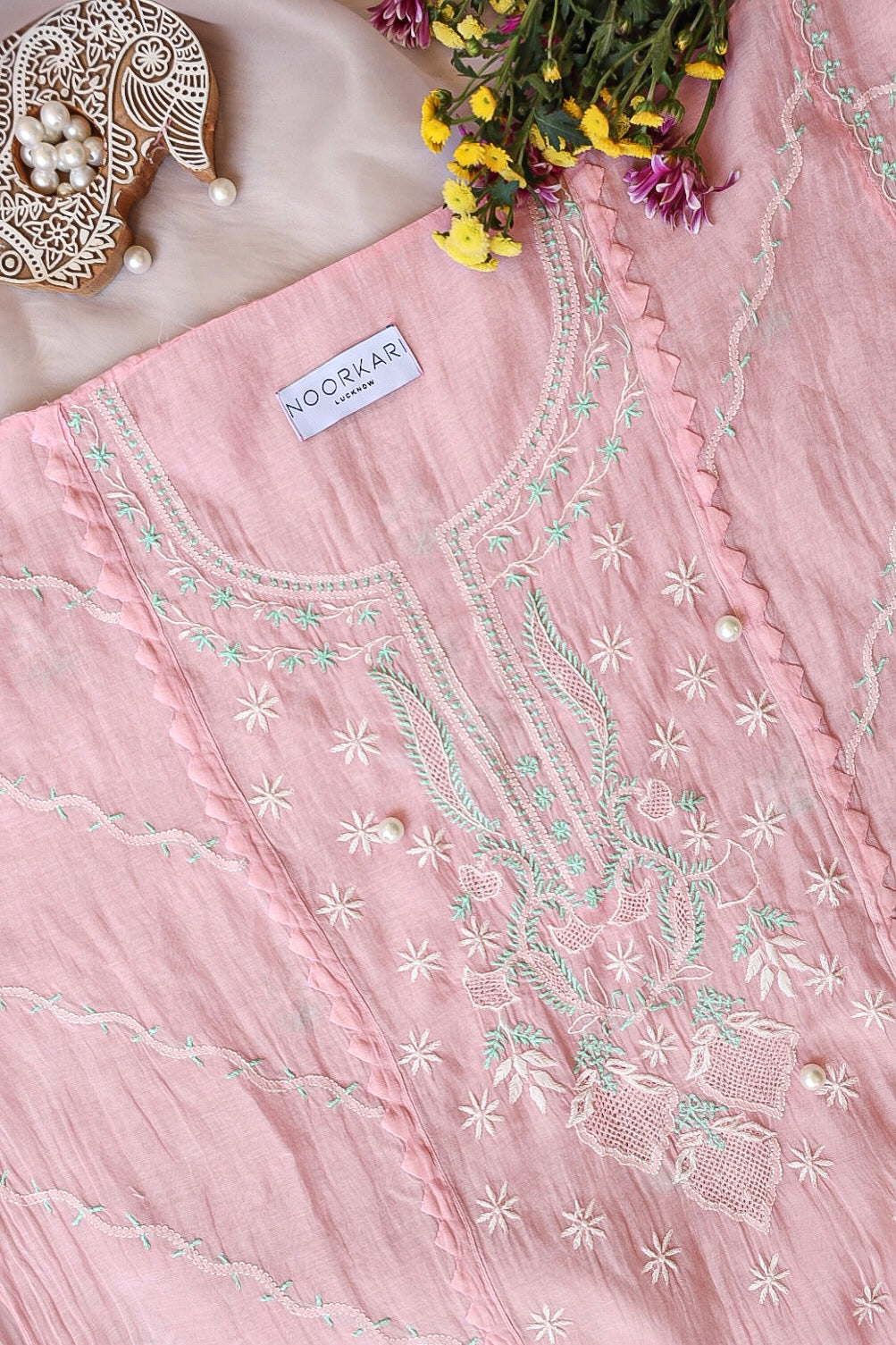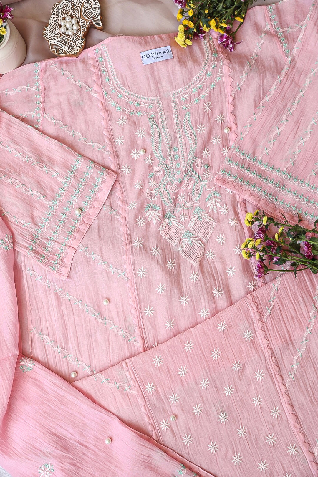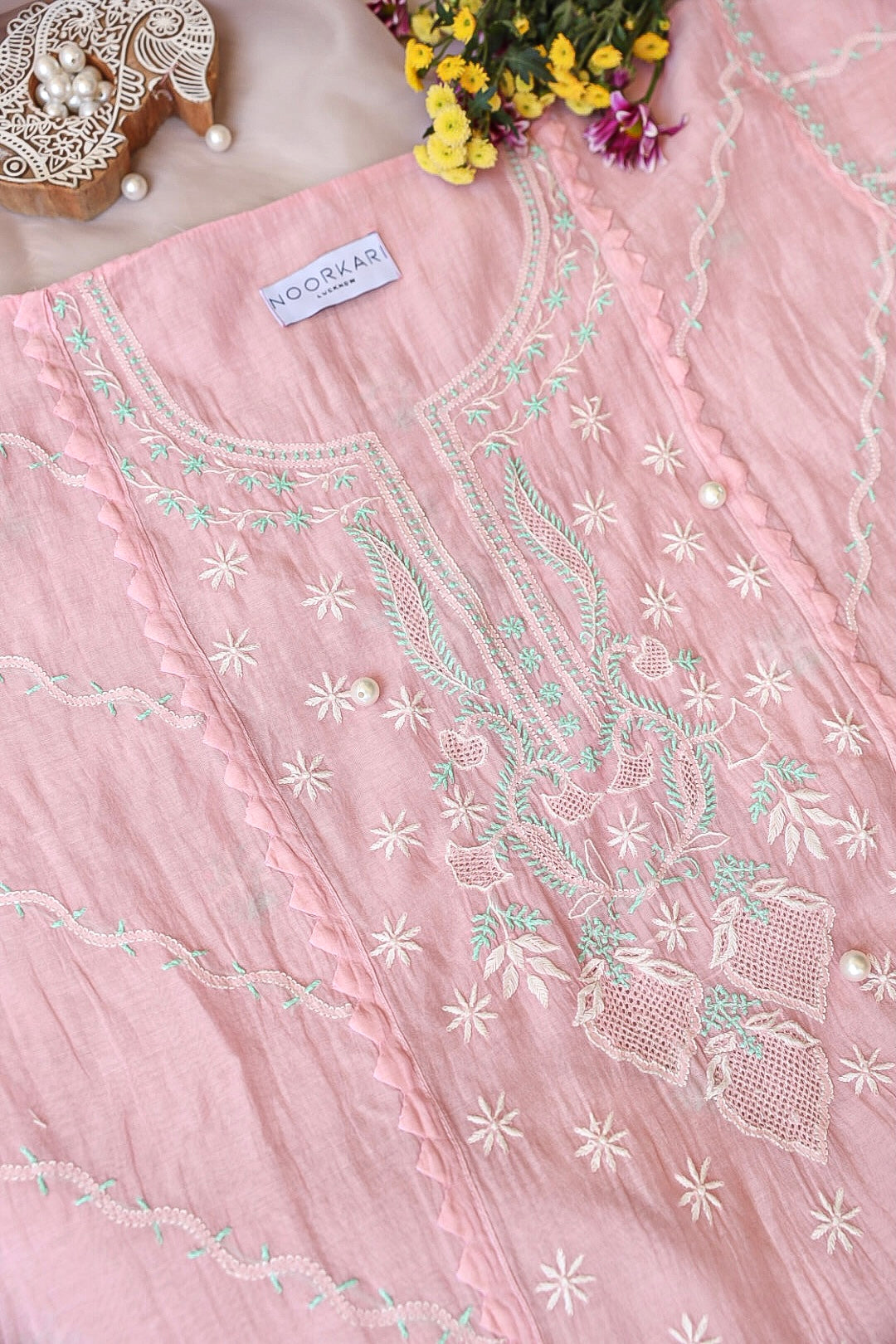Chikankari is an Art of delicate handwork of Lucknow. It is a handcrafted process where the wooden blocks are manually carved in various designs, and the natural stew for printing is prepared, and printed on the cloth. The chikankari craftsmen then use ten ary of the needlecraft embroidery, and perform the needlework artistically. There are 32 stitches of chikankari broadly classified into Raised stitch, Embossed and Flat stitch.