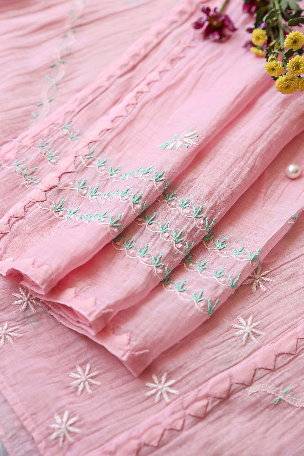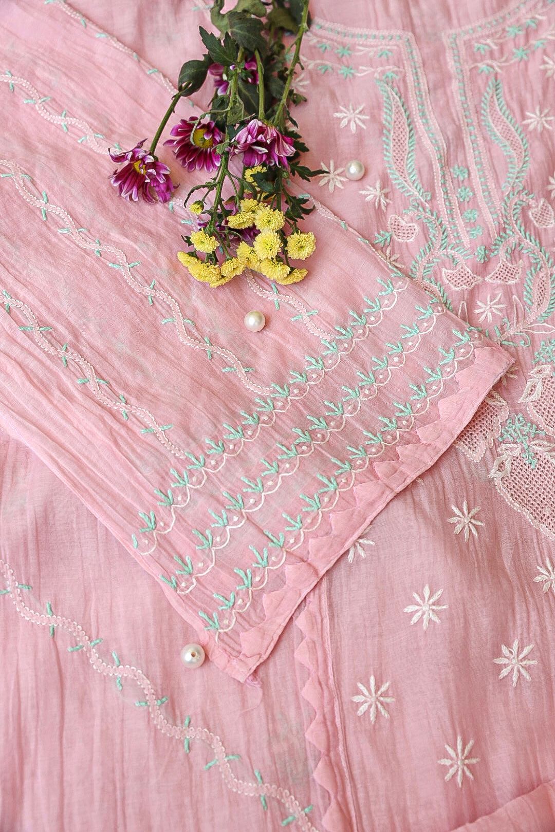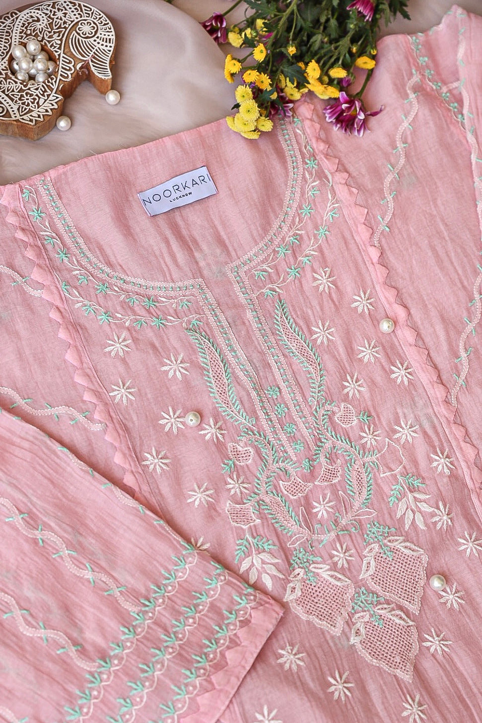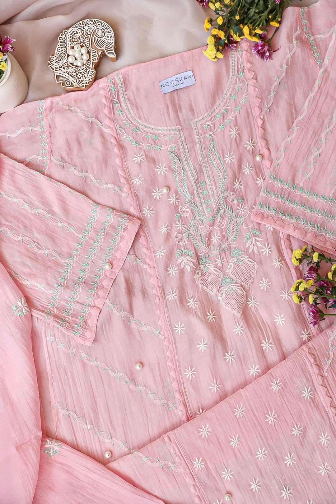 Chikankari is an Art of delicate handwork of Lucknow. It is a handcrafted process where the wooden blocks are manually carved in various designs, and the natural stew for printing is prepared, and printed on the cloth. The chikankari craftsmen then use ten ary of the needlecraft embroidery, and perform the needlework artistically. There are 32 stitches of chikankari broadly classified into Raised stitch, Embossed and Flat stitch.
