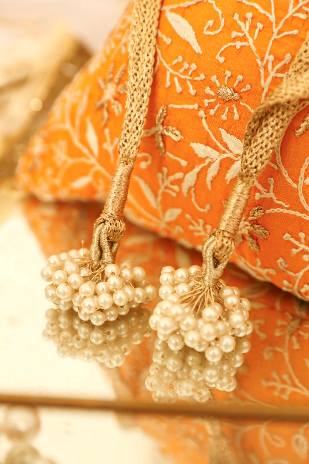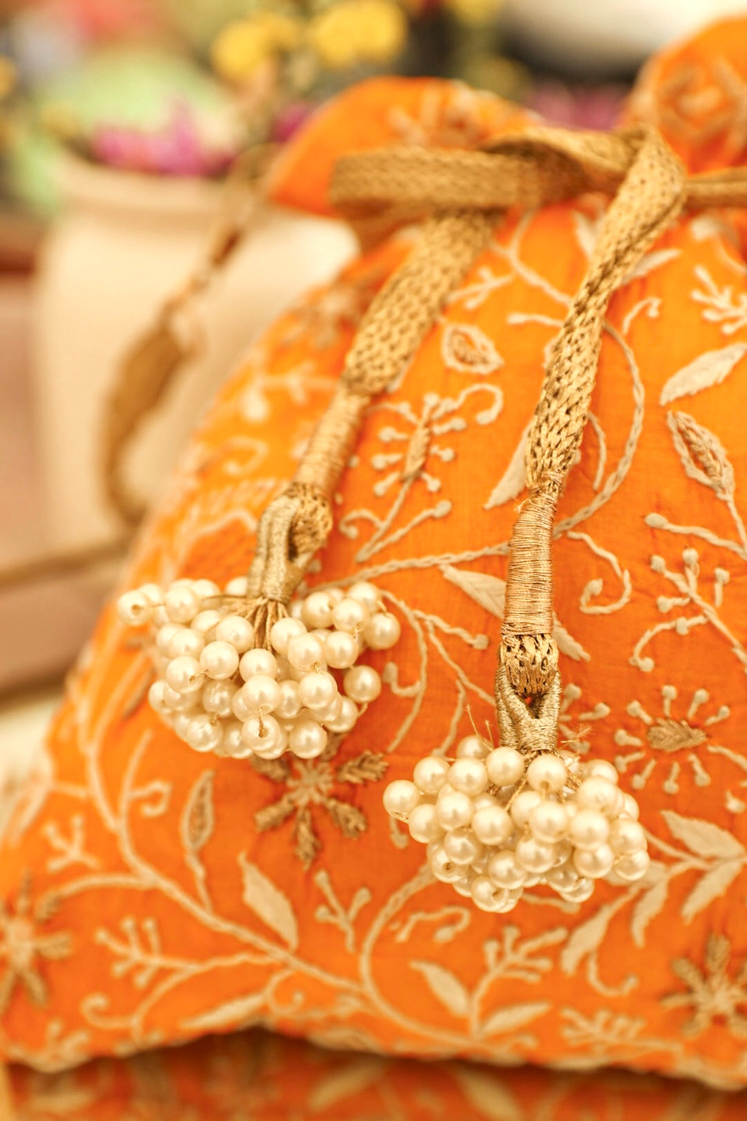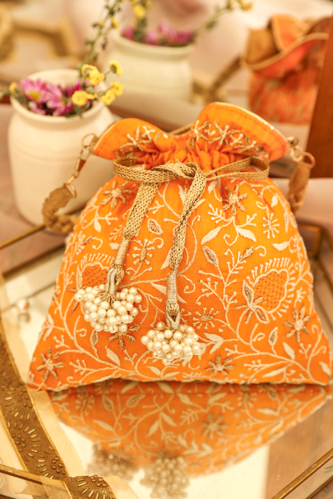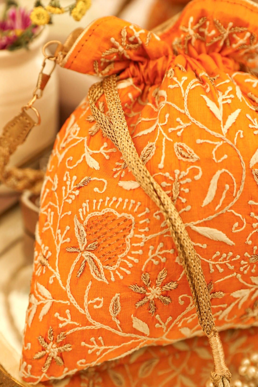 Embrace the exquisiteness of being bold and rediscover who you are! Craft new stories, cherish the love of being timeless! Inner: From the inside, the material used in potli is the silk foam. It gives a superior finish to the polti.