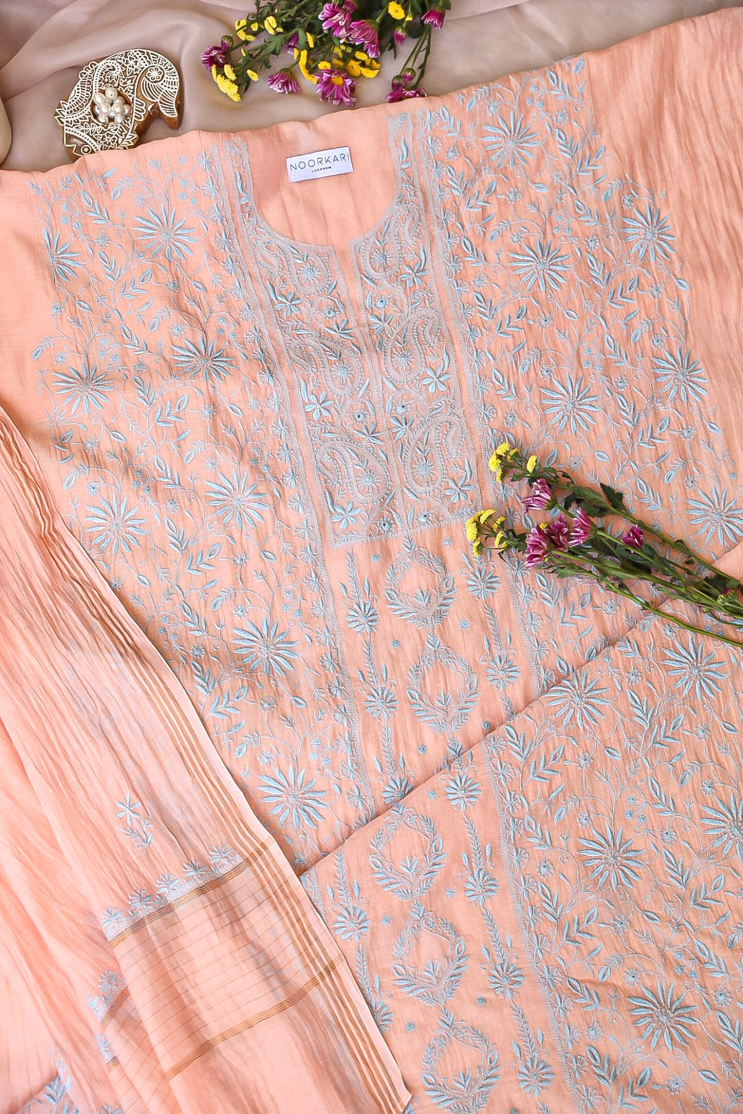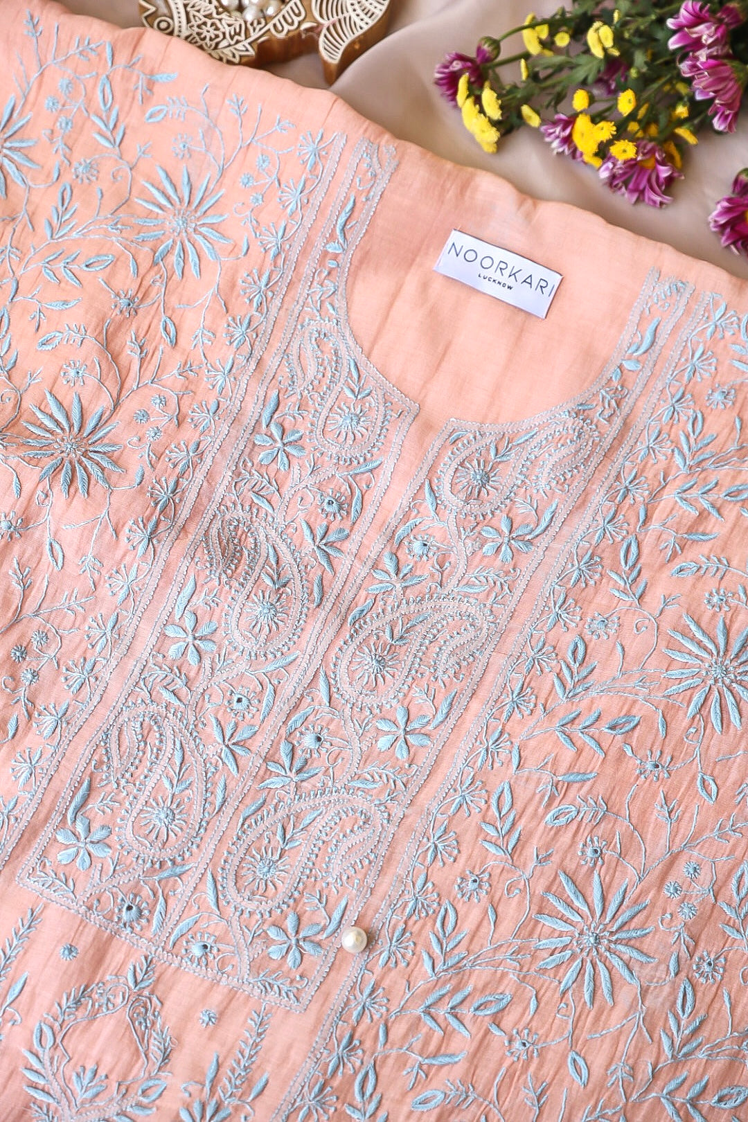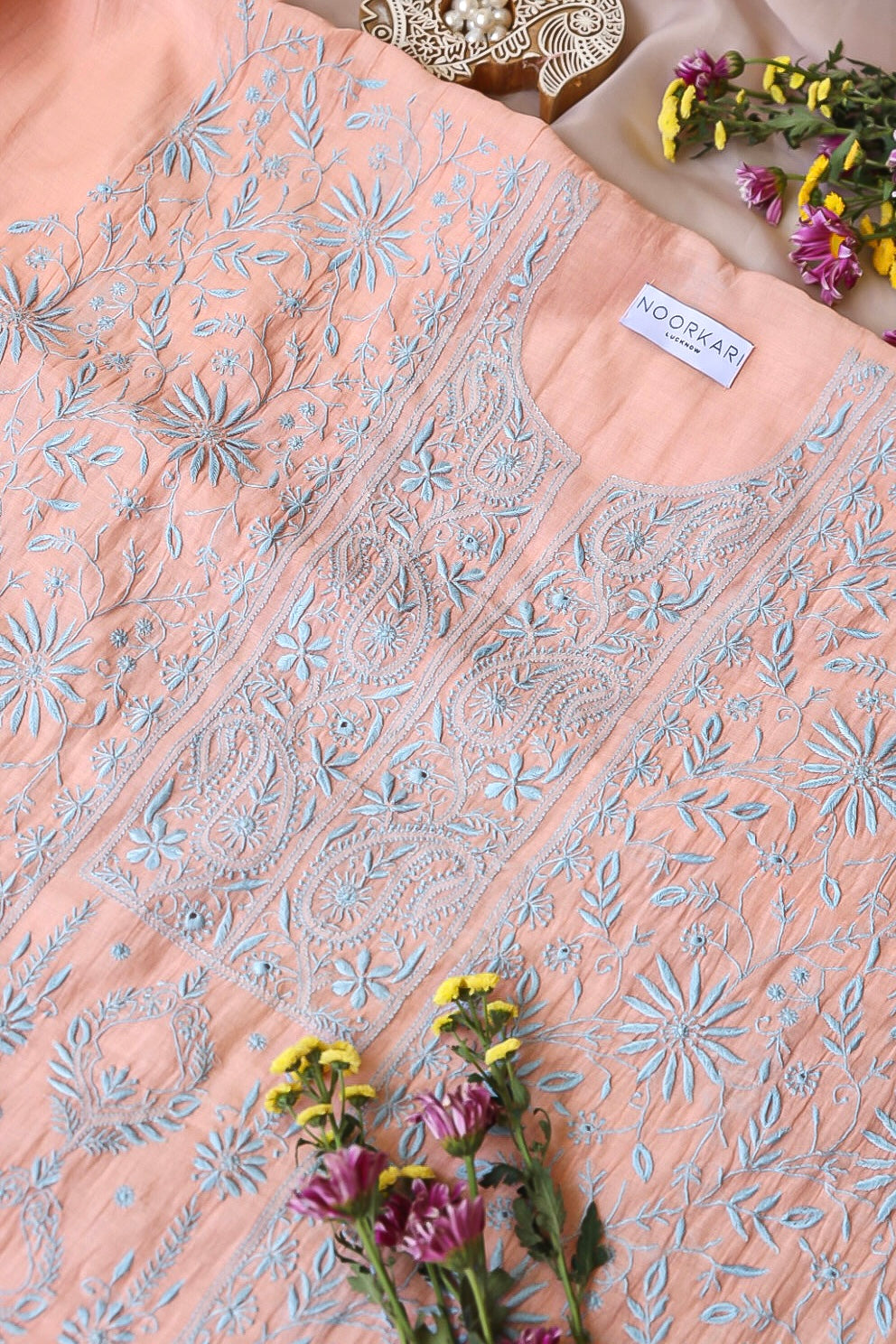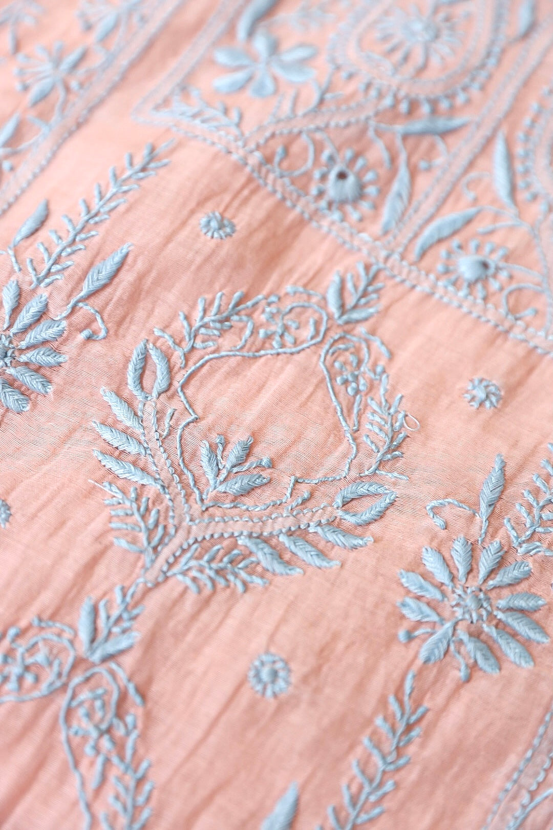 Chikankari is an Art of delicate handwork of Lucknow. It is a handcrafted process where the wooden blocks are manually carved in various designs, and the natural stew for printing is prepared, and printed on the cloth. The chikankari craftsmen then use ten ary of the needlecraft embroidery, and perform the needlework artistically. There are 32 stitches of chikankari broadly classified into Raised stitch, Embossed and Flat stitch.