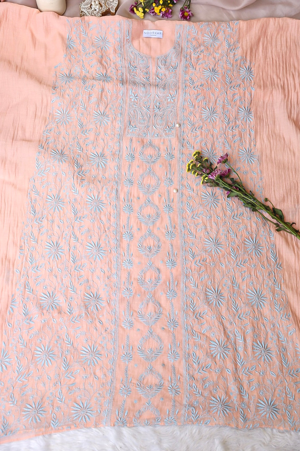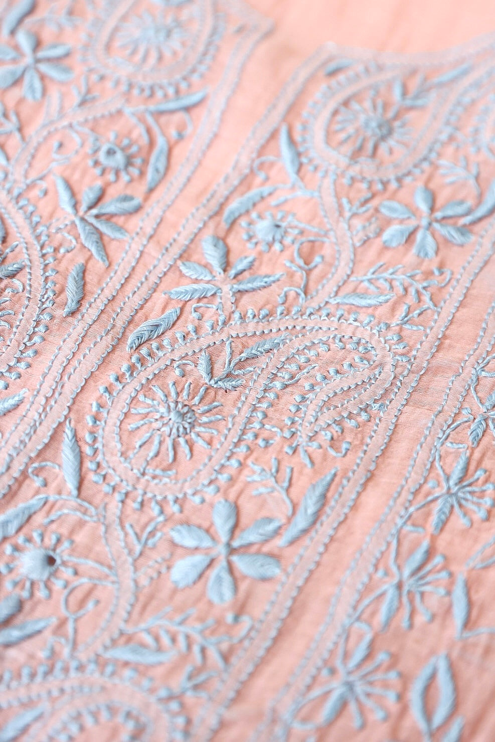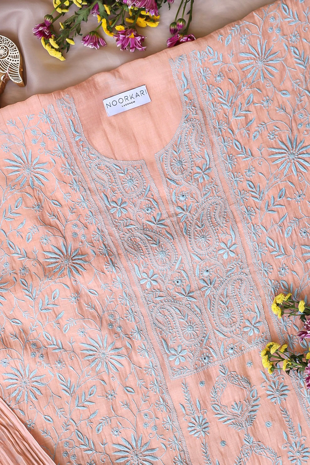 Chikankari is an Art of delicate handwork of Lucknow. It is a handcrafted process where the wooden blocks are manually carved in various designs, and the natural stew for printing is prepared, and printed on the cloth. The chikankari craftsmen then use ten ary of the needlecraft embroidery, and perform the needlework artistically. There are 32 stitches of chikankari broadly classified into Raised stitch, Embossed and Flat stitch.