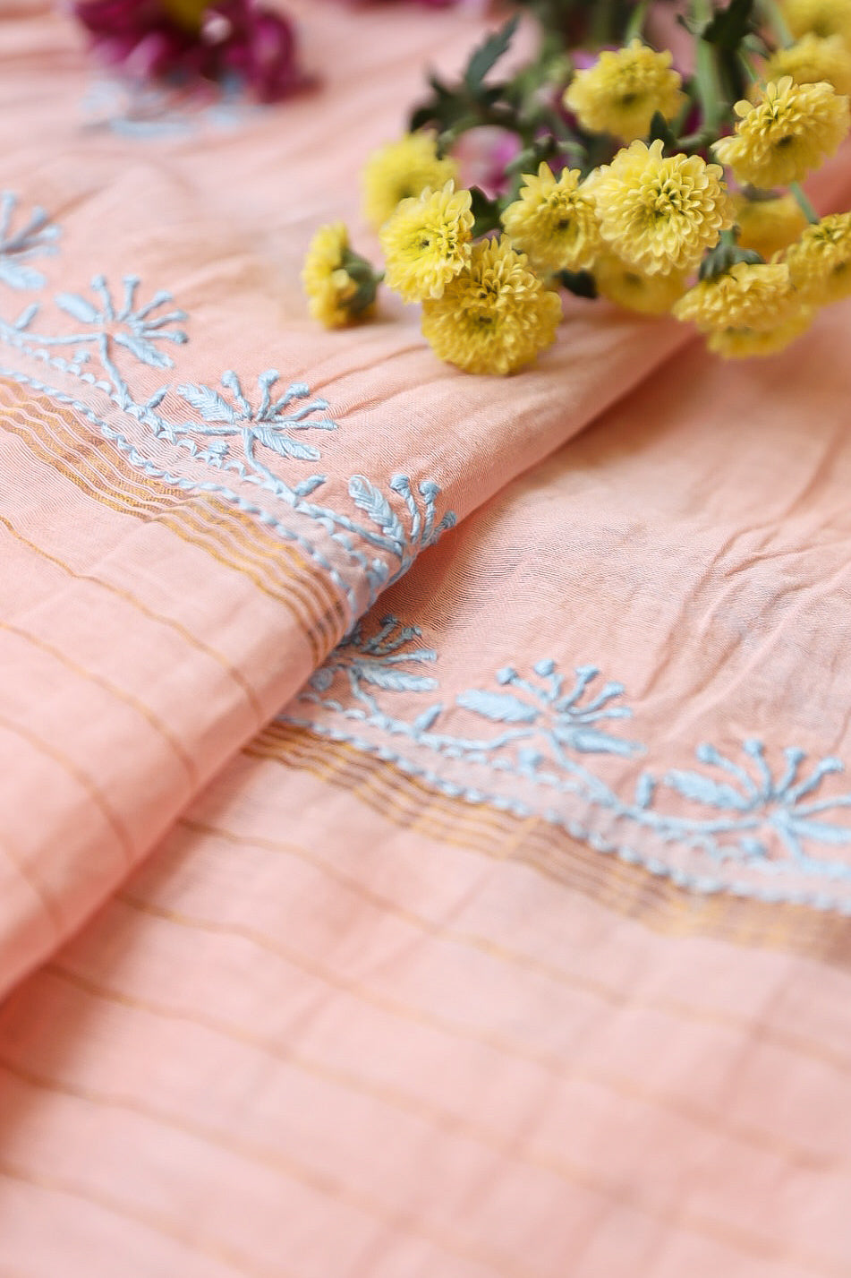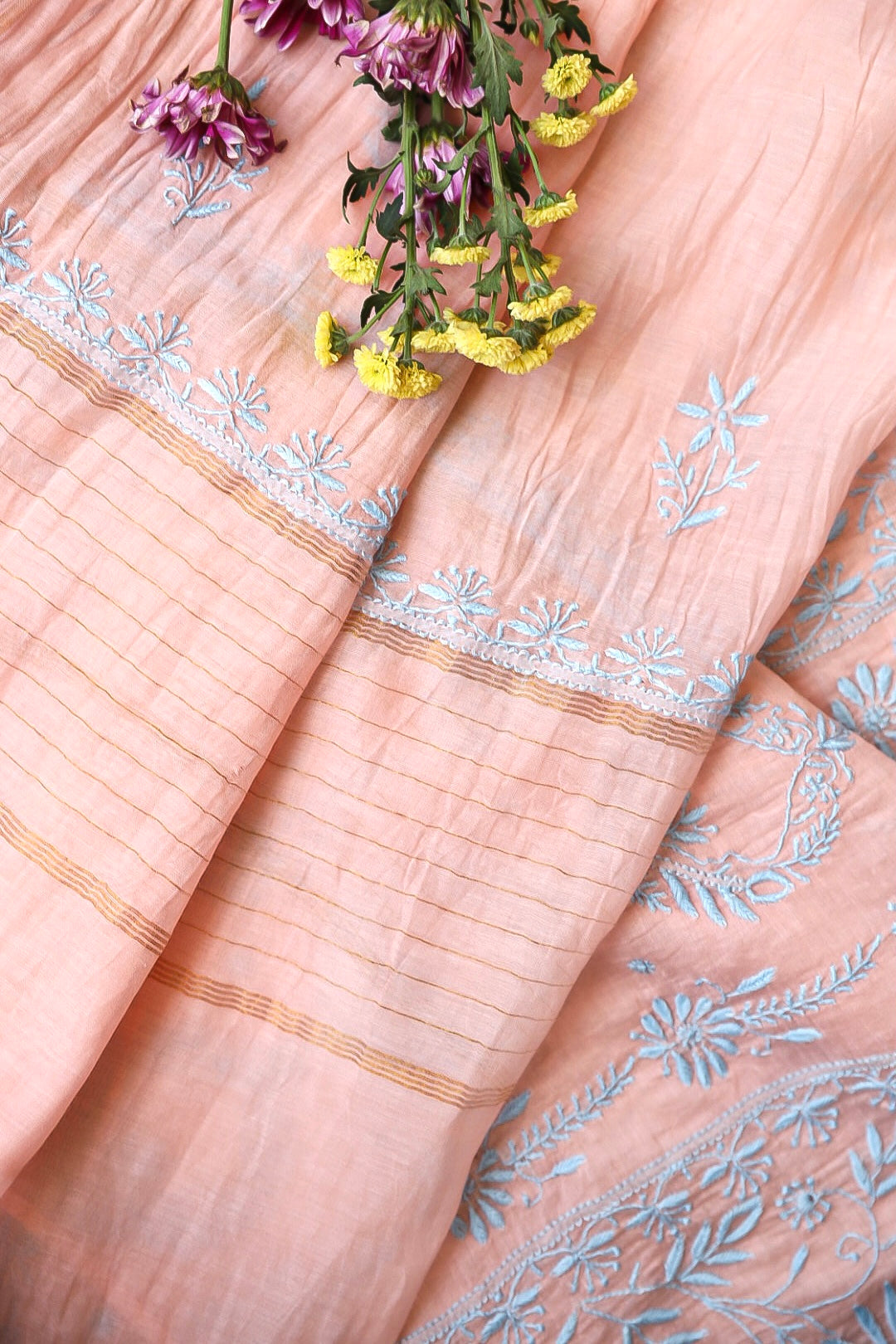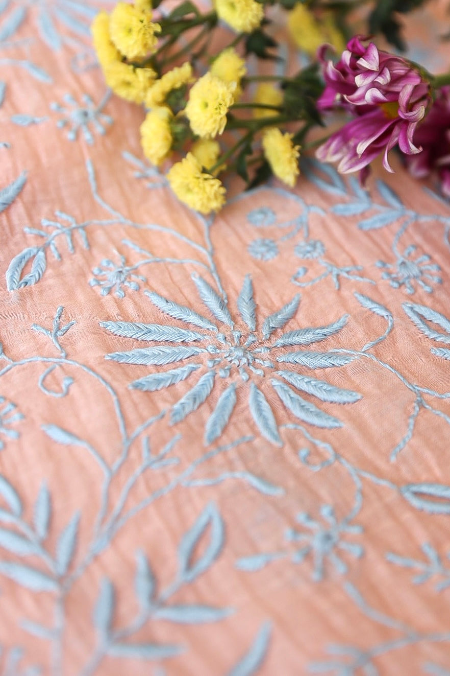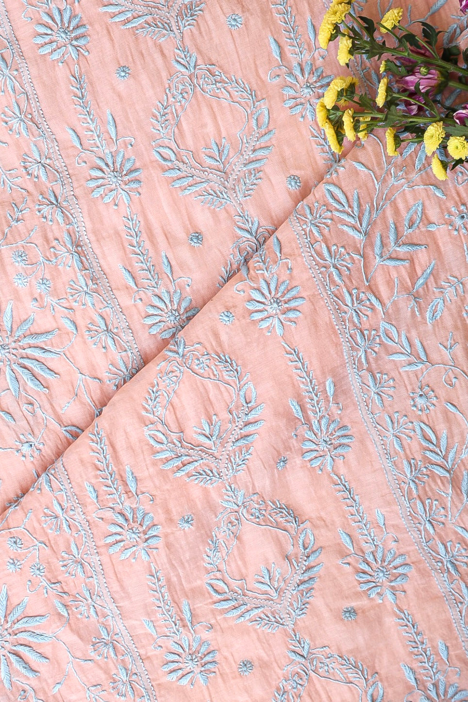 Chikankari is an Art of delicate handwork of Lucknow. It is a handcrafted process where the wooden blocks are manually carved in various designs, and the natural stew for printing is prepared, and printed on the cloth. The chikankari craftsmen then use ten ary of the needlecraft embroidery, and perform the needlework artistically. There are 32 stitches of chikankari broadly classified into Raised stitch, Embossed and Flat stitch.