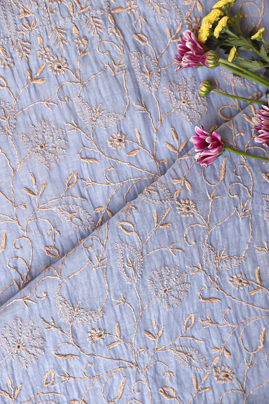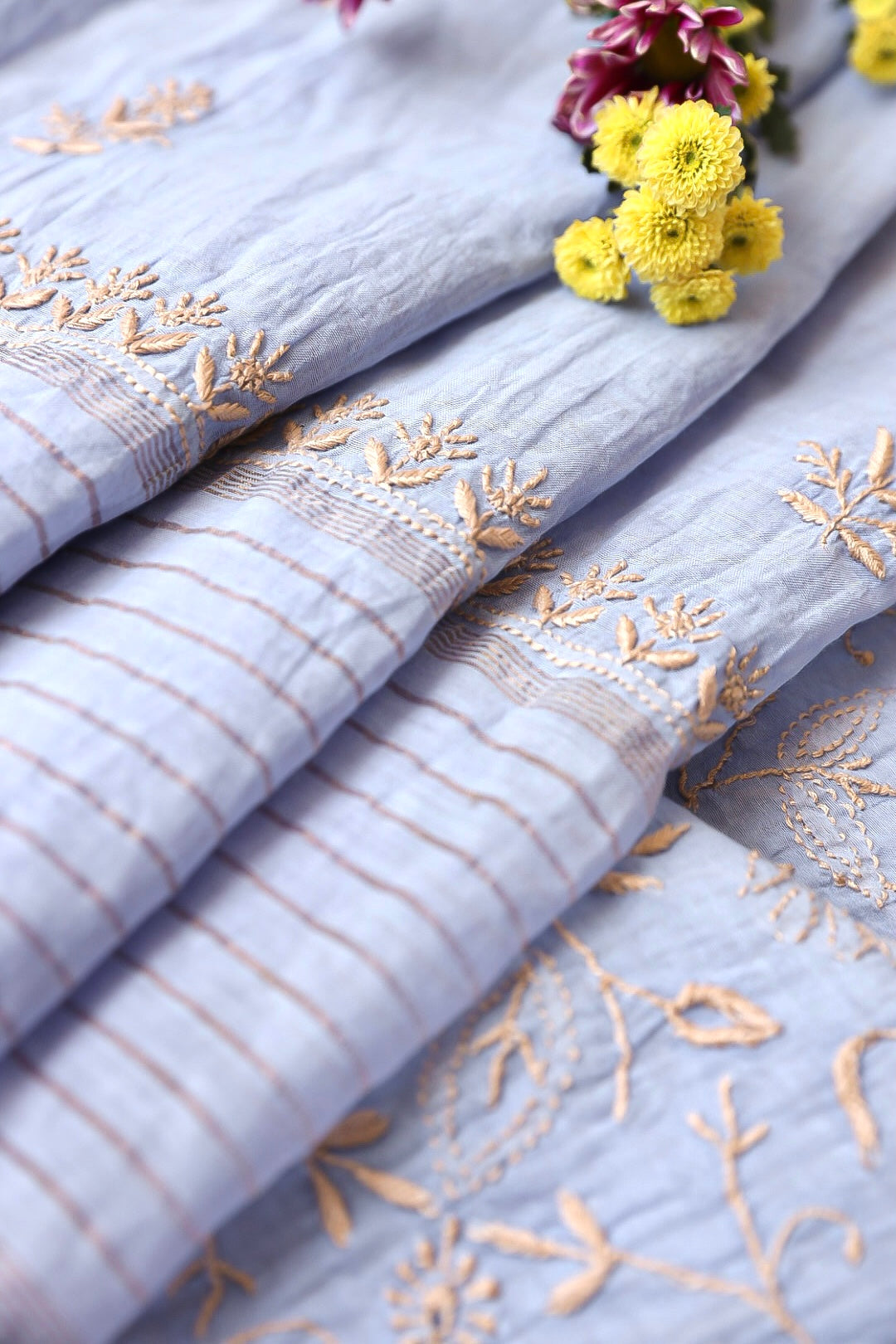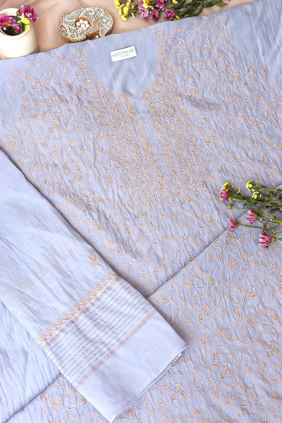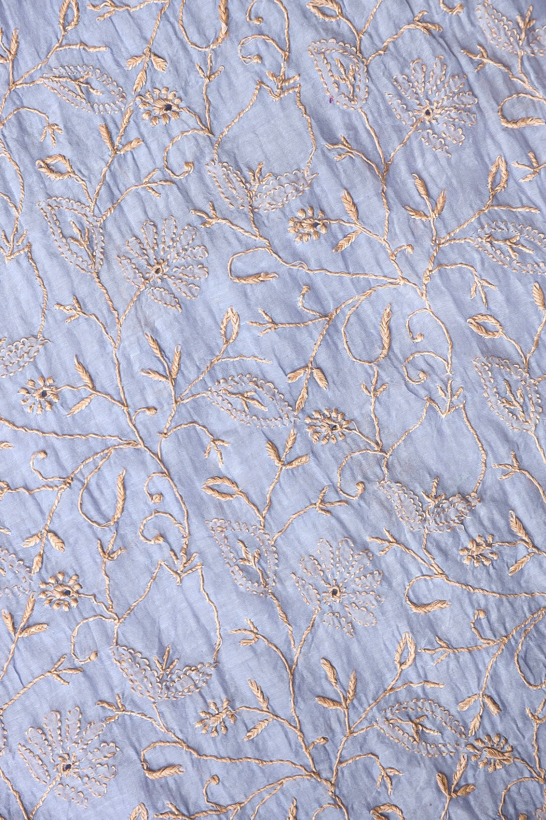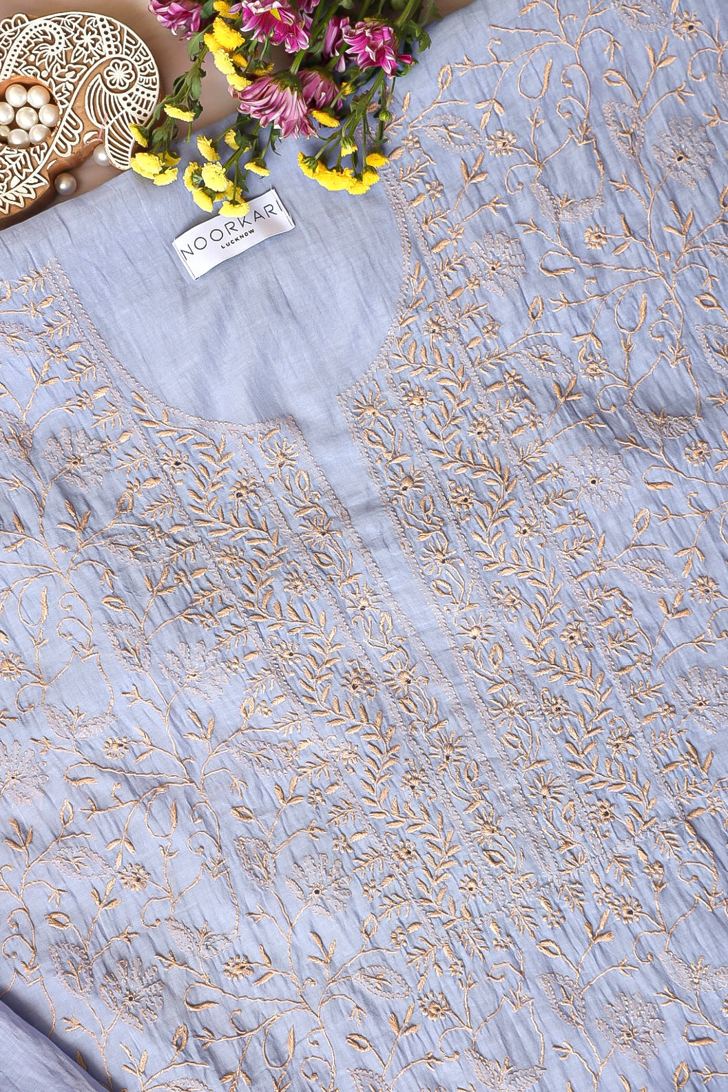 Chikankari is an Art of delicate handwork of Lucknow. It is a handcrafted process where the wooden blocks are manually carved in various designs, and the natural stew for printing is prepared, and printed on the cloth. The chikankari craftsmen then use ten ary of the needlecraft embroidery, and perform the needlework artistically. There are 32 stitches of chikankari broadly classified into Raised stitch, Embossed and Flat stitch.