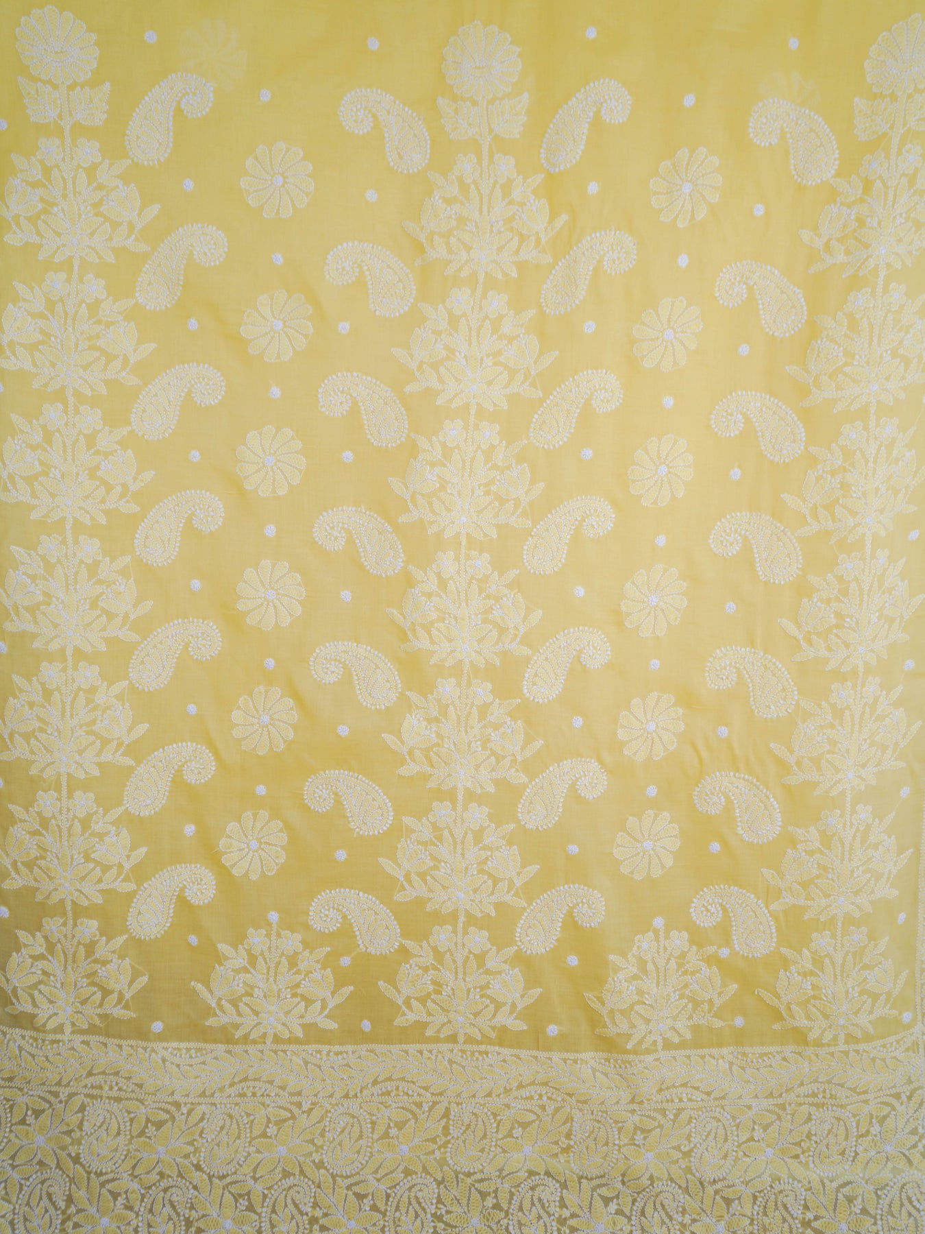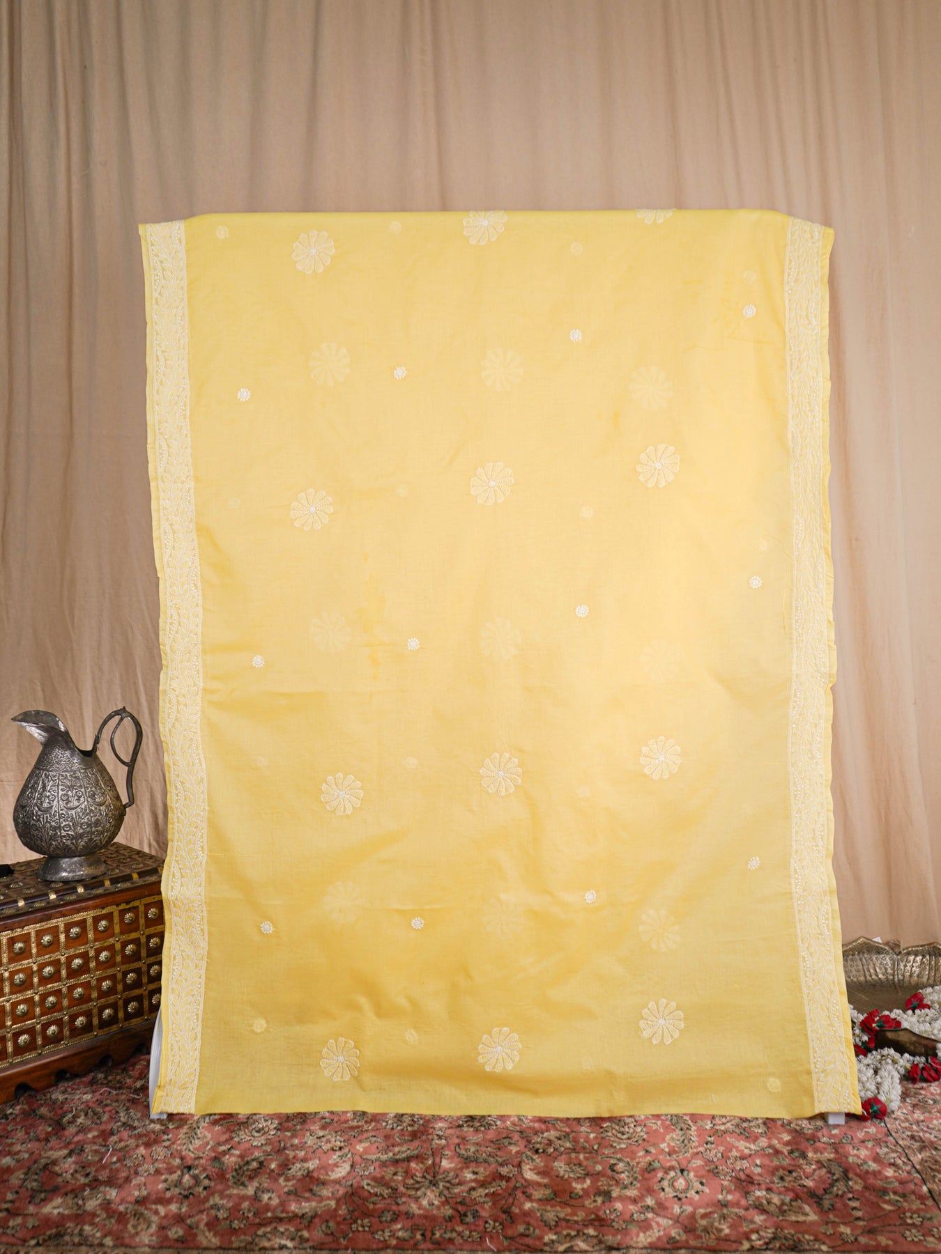 Fabric : Cotton Length : 6.5 metres Height : 44 inches Blouse Fabric : 1 metre Thread : Type : Cotton Embroidery :100% hand embroidered Embellishments : None Occasion : Daily Wear Washing instructions : Dry Clean Storage instructions : Use muslin bags to safeguard your sarees Trivia : Chikankari is an Art of delicate handwork of Lucknow. It is a handcrafted process where the wooden blocks are manually carved in various designs, and the natural stew for printing is prepared, and printed on the cloth. The chikankari craftsmen then use ten ary of the needlecraft embroidery, and perform the needlework artistically. There are 32 stitches of chikankari broadly classified into Raised stitch, Embossed and Flat stitch. Time Period Of Handmade- It took 2 to 3 months for the product to be handcrafted from designing to finishing. Disclaimer : There might be a 10-15% difference in colour due to high screen resolution. Therefore, exchanges due to colour difference is not acceptable Misspelled : Nurkari, Noorkaree, Nurkaari, Noorkary, Noor-Kari