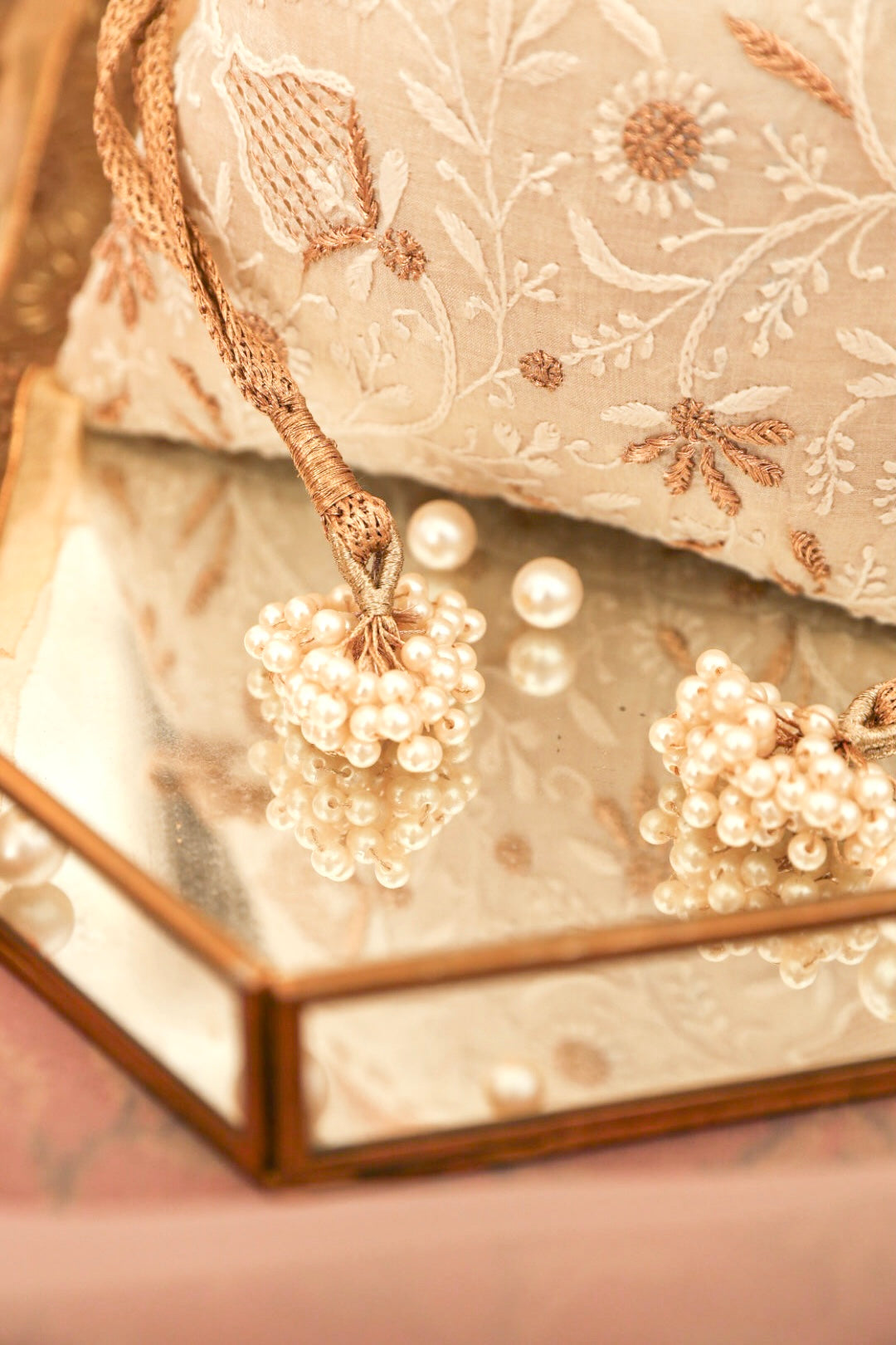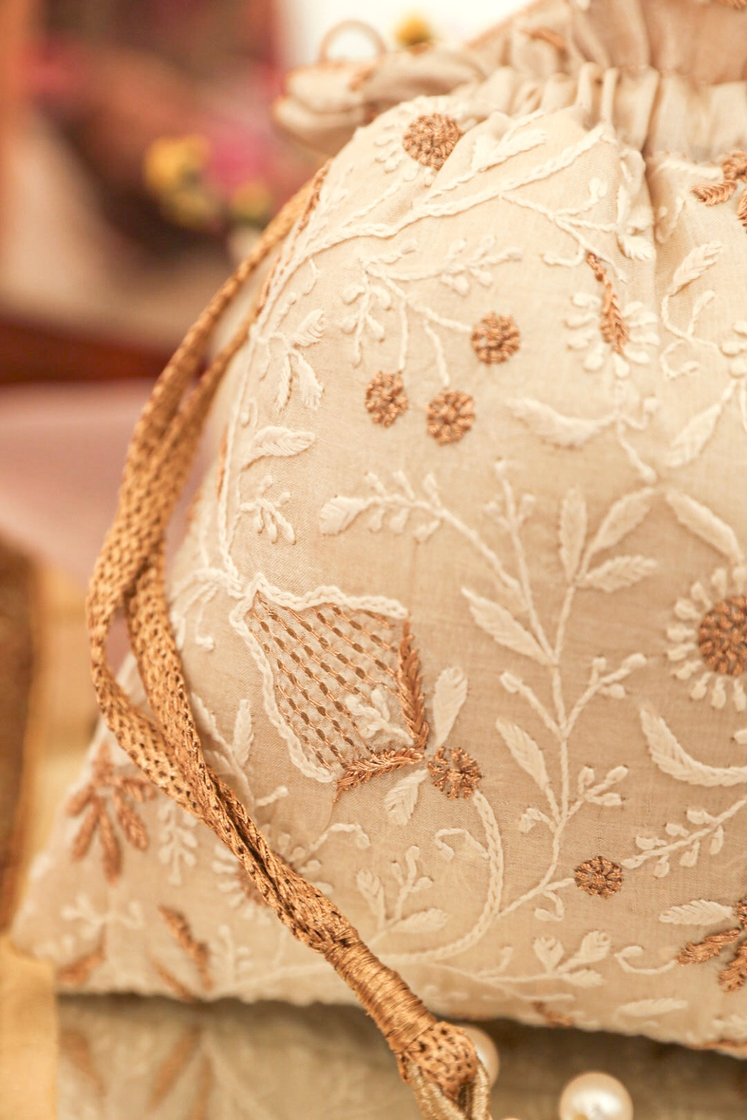 Embrace the exquisiteness of being bold and rediscover who you are! Craft new stories, cherish the love of being timeless! Inner: From the inside, the material used in potli is the silk foam. It gives a superior finish to the polti.
