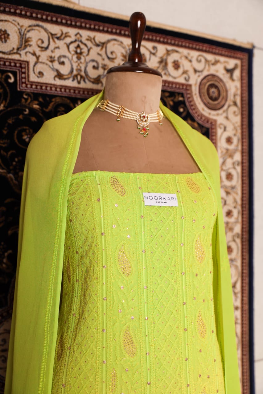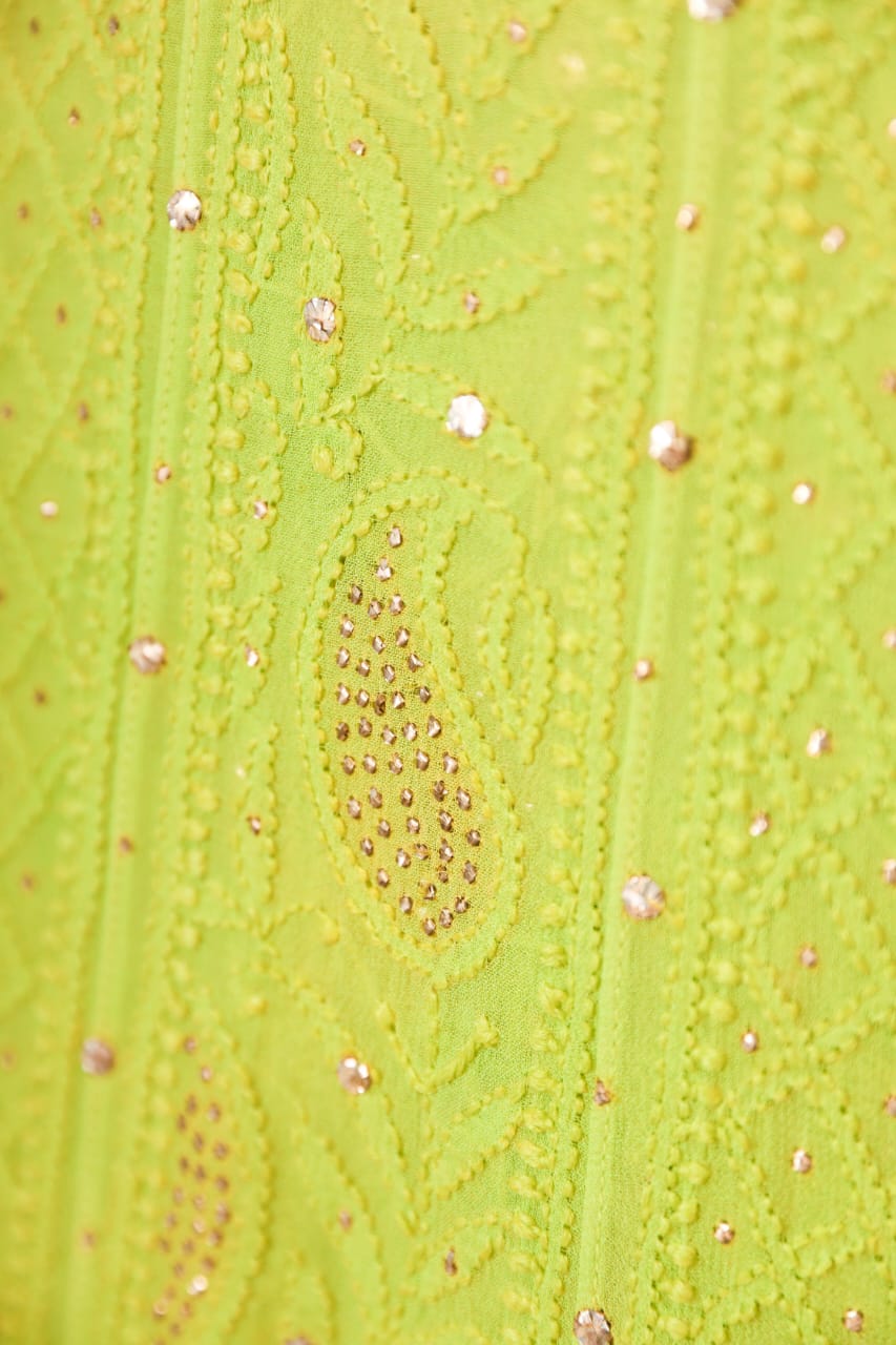 Chikankari is an Art of delicate handwork of Lucknow. It is a handcrafted process where the wooden blocks are manually carved in various designs, and the natural stew for printing is prepared, and printed on the cloth. The chikankari craftsmen then use ten ary of the needlecraft embroidery, and perform the needlework artistically. There are 32 stitches of chikankari broadly classified into Raised stitch, Embossed and Flat stitch.