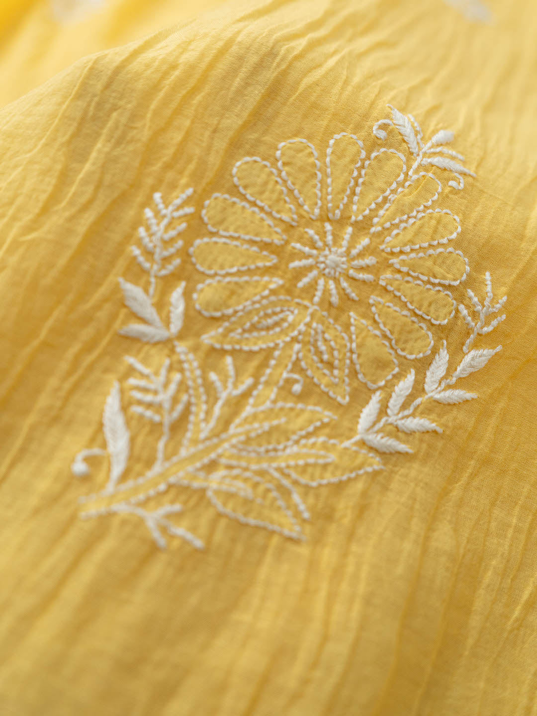 Chikankari is an Art of delicate handwork of Lucknow. It is a handcrafted process where the wooden blocks are manually carved in various designs, and the natural stew for printing is prepared, and printed on the cloth. The chikankari craftsmen then use ten ary of the needlecraft embroidery, and perform the needlework artistically. There are 32 stitches of chikankari broadly classified into Raised stitch, Embossed and Flat stitch.