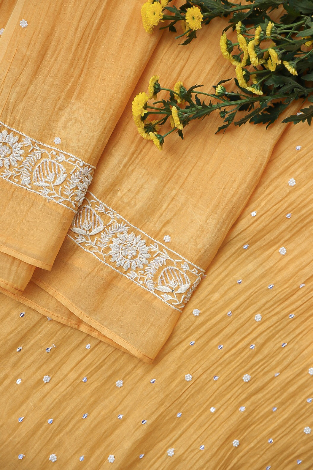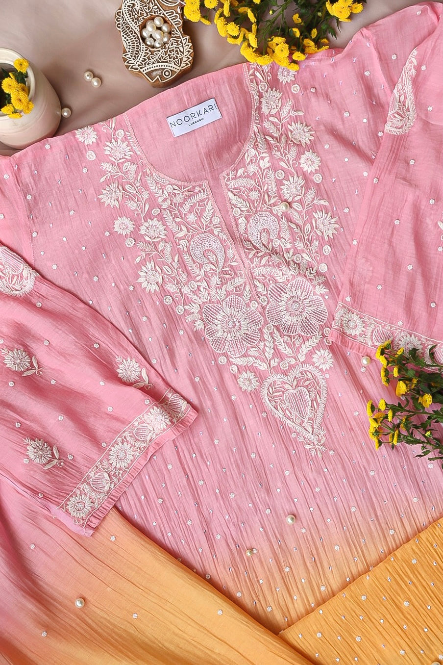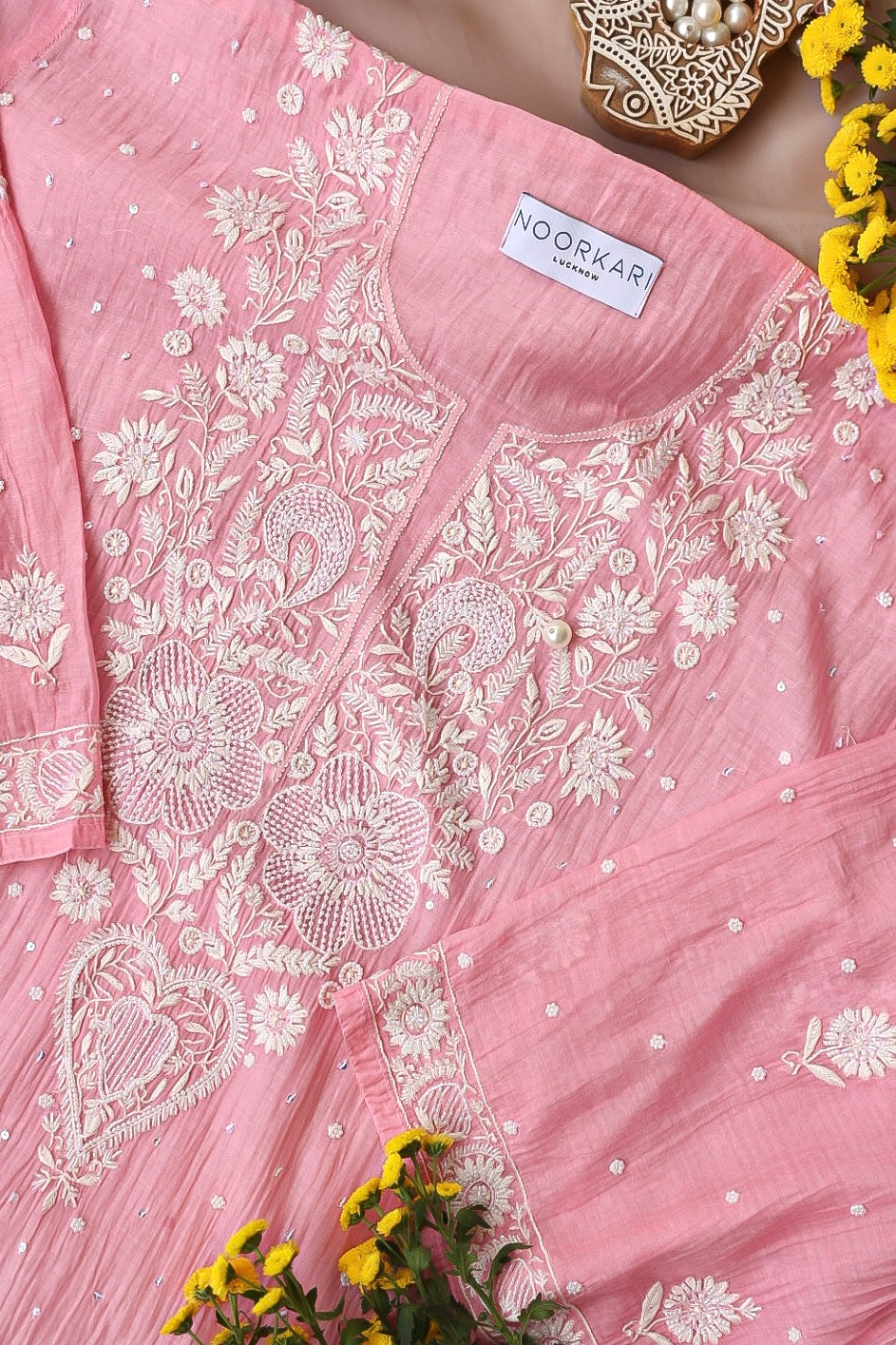 Chikankari is an Art of delicate handwork of Lucknow. It is a handcrafted process where the wooden blocks are manually carved in various designs, and the natural stew for printing is prepared, and printed on the cloth. The chikankari craftsmen then use ten ary of the needlecraft embroidery, and perform the needlework artistically. There are 32 stitches of chikankari broadly classified into Raised stitch, Embossed and Flat stitch.