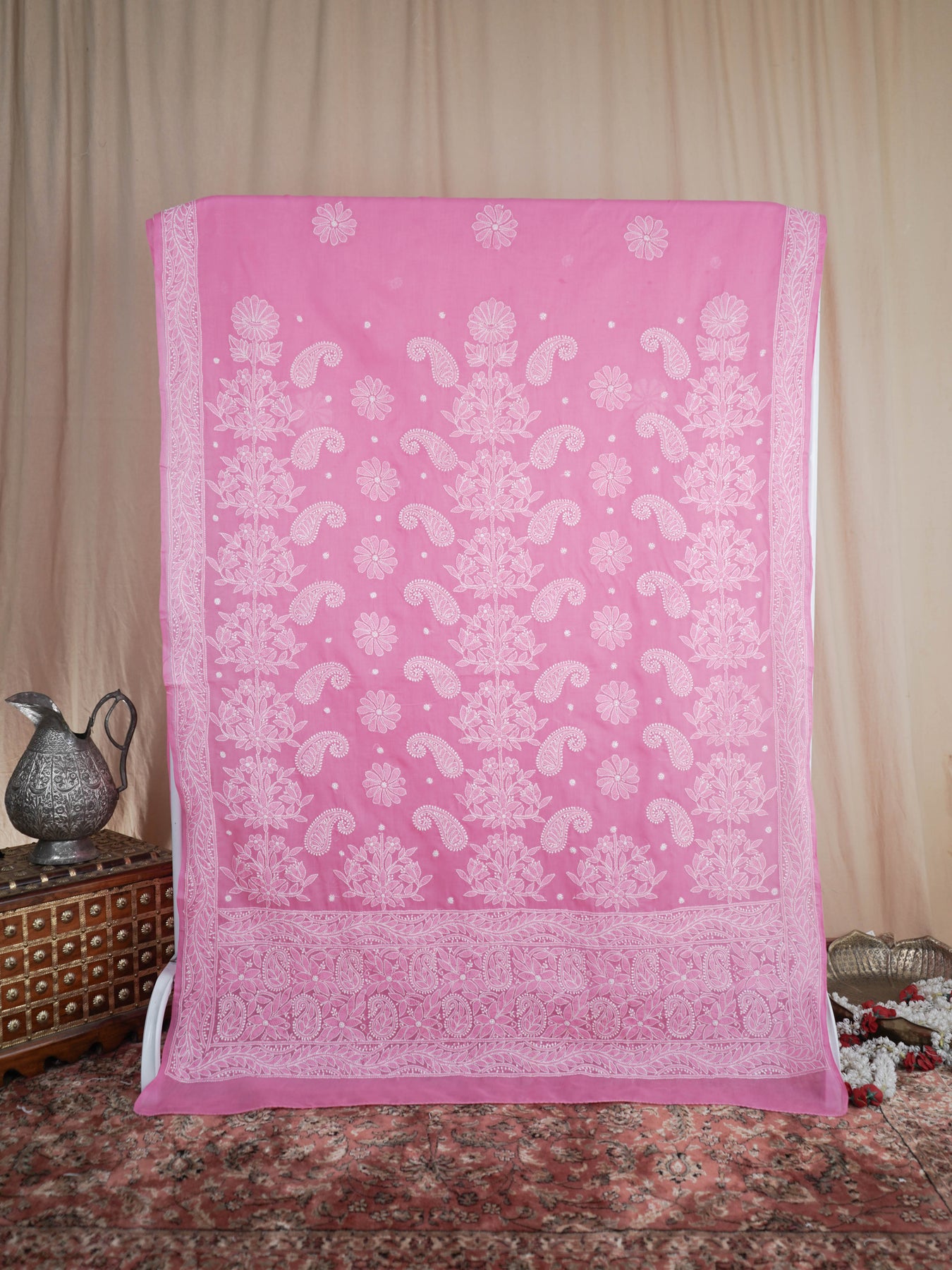 Chikankari is an Art of delicate handwork of Lucknow. It is a handcrafted process where the wooden blocks are manually carved in various designs, and the natural stew for printing is prepared, and printed on the cloth. The chikankari craftsmen then use ten ary of the needlecraft embroidery, and perform the needlework artistically. There are 32 stitches of chikankari broadly classified into Raised stitch, Embossed and Flat stitch.
