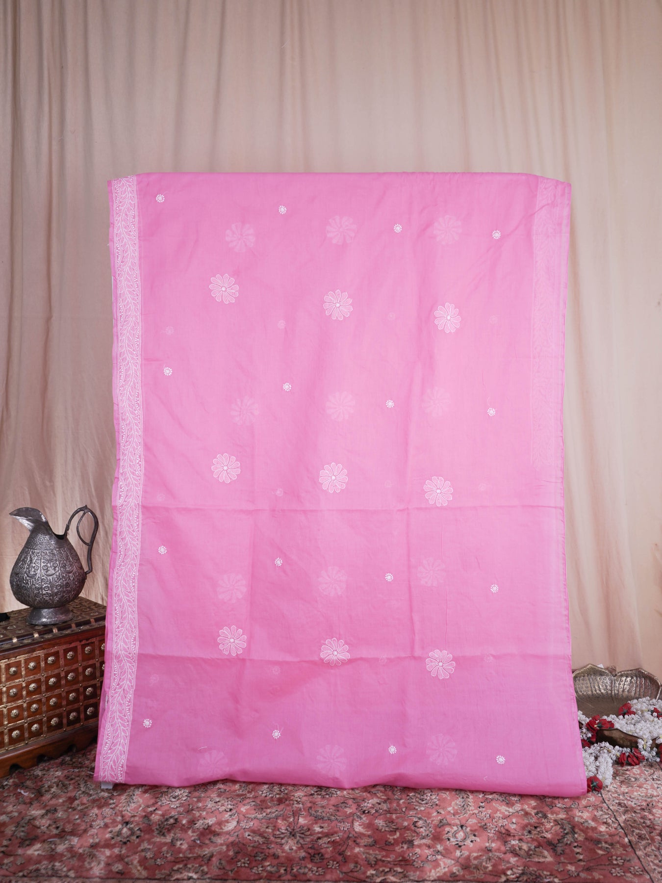 Fabric : Cotton Length : 6.5 metres Height : 44 inches Blouse Fabric : 1 metre Thread : Type : Cotton Embroidery :100% hand embroidered Embellishments : None Occasion : Daily Wear Washing instructions : Dry Clean Storage instructions : Use muslin bags to safeguard your sarees Trivia : Chikankari is an Art of delicate handwork of Lucknow. It is a handcrafted process where the wooden blocks are manually carved in various designs, and the natural stew for printing is prepared, and printed on the cloth. The chikankari craftsmen then use ten ary of the needlecraft embroidery, and perform the needlework artistically. There are 32 stitches of chikankari broadly classified into Raised stitch, Embossed and Flat stitch. Time Period Of Handmade- It took 2 to 3 months for the product to be handcrafted from designing to finishing. Disclaimer : There might be a 10-15% difference in colour due to high screen resolution. Therefore, exchanges due to colour difference is not acceptable Misspelled : Nurkari, Noorkaree, Nurkaari, Noorkary, Noor-Kari