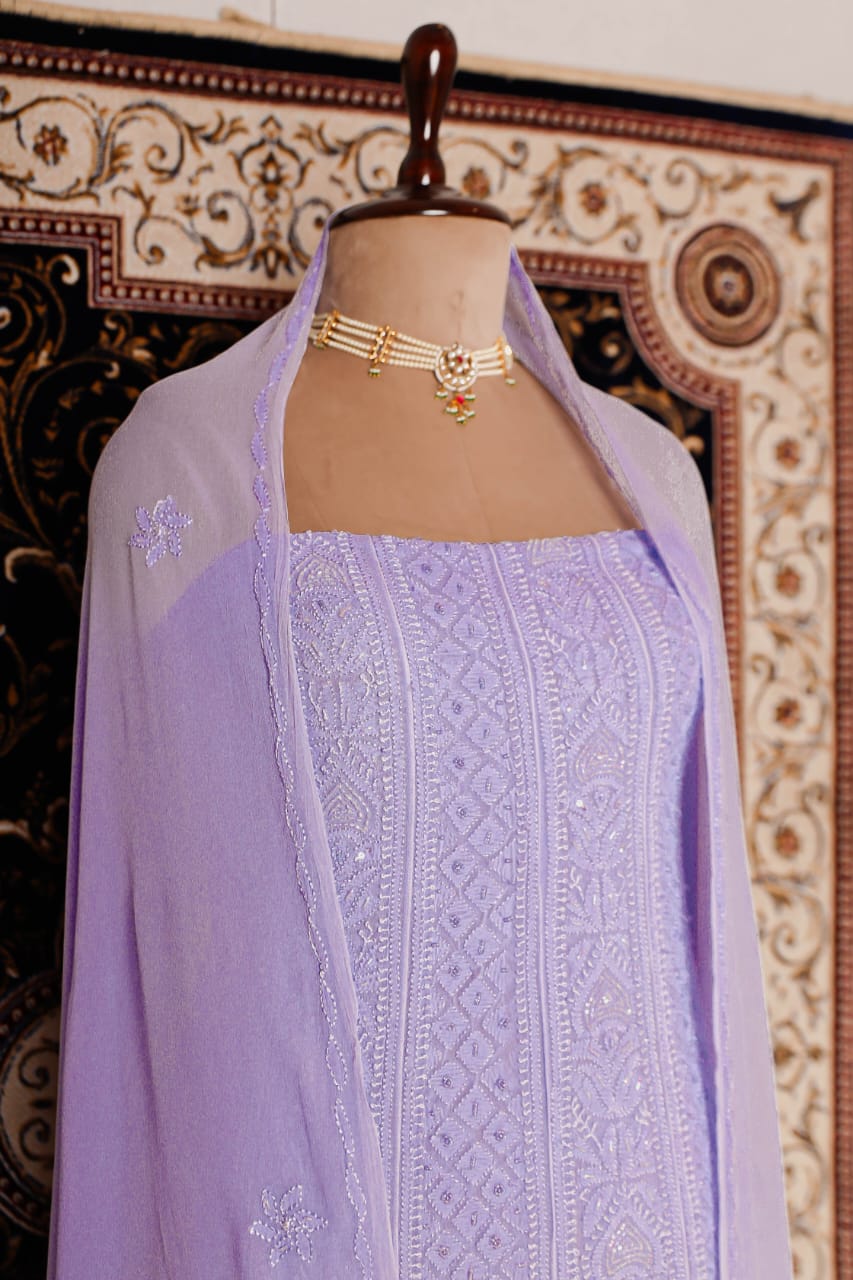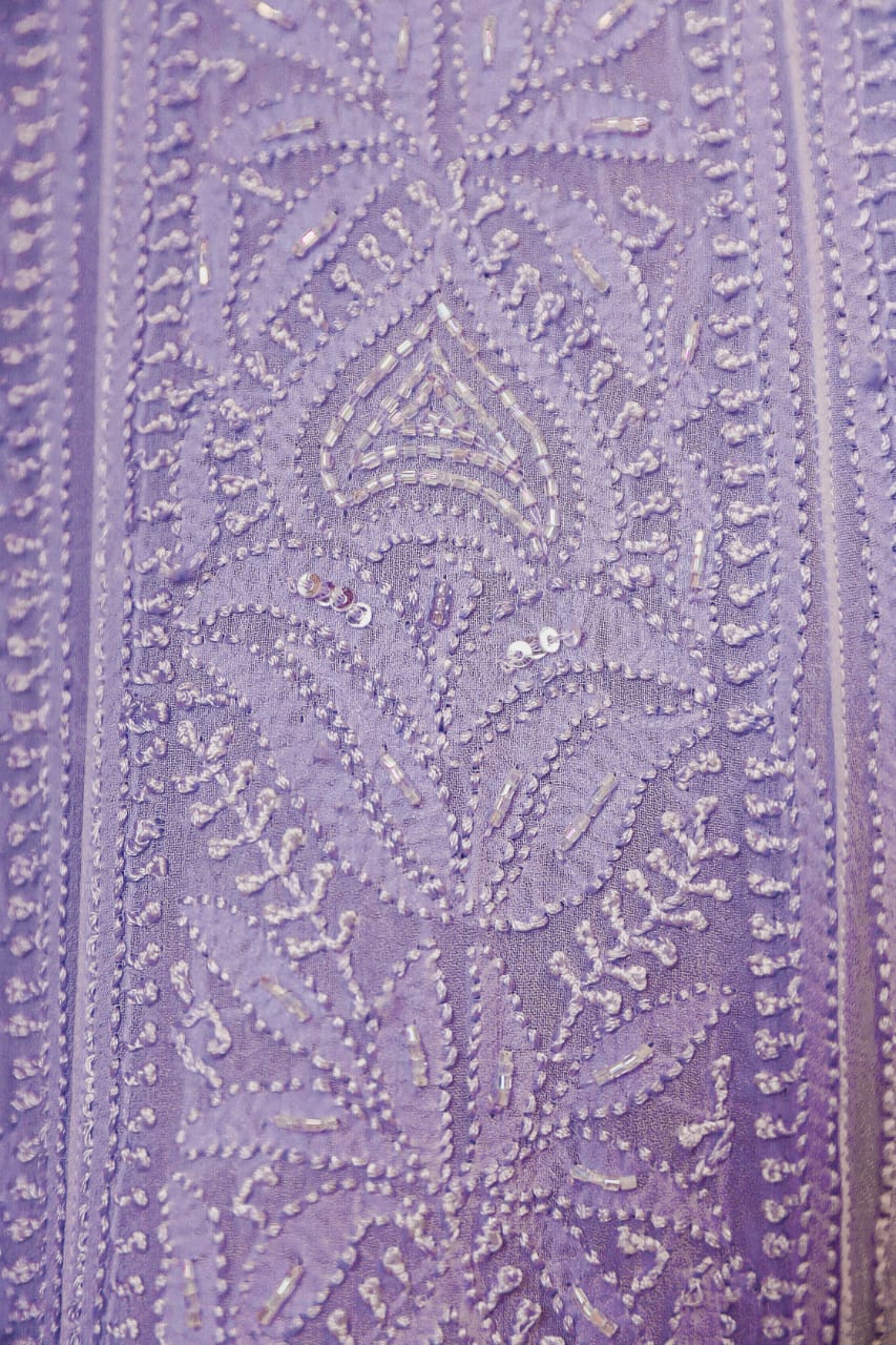 Chikankari is an Art of delicate handwork of Lucknow. It is a handcrafted process where the wooden blocks are manually carved in various designs, and the natural stew for printing is prepared, and printed on the cloth. The chikankari craftsmen then use ten ary of the needlecraft embroidery, and perform the needlework artistically. There are 32 stitches of chikankari broadly classified into Raised stitch, Embossed and Flat stitch.