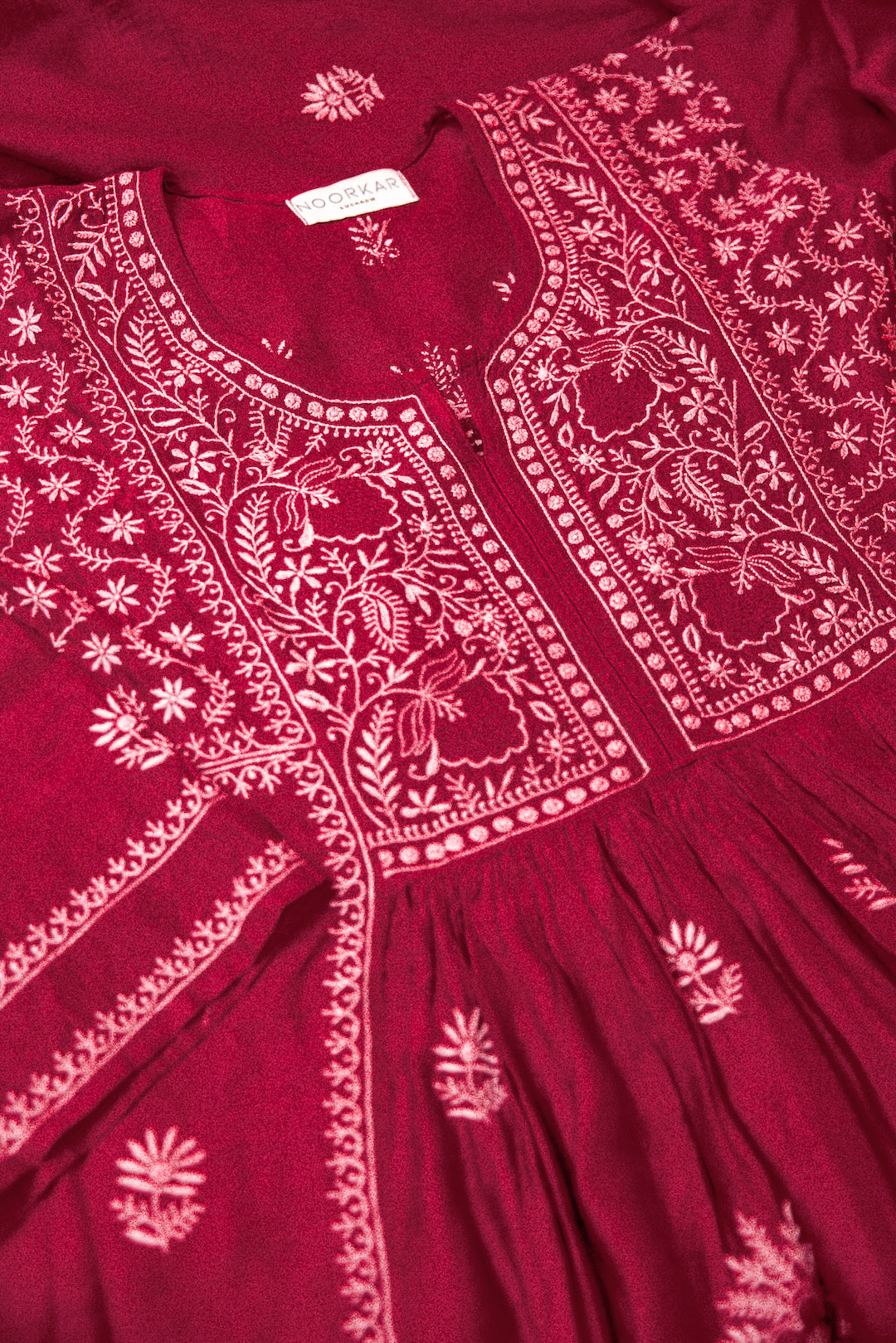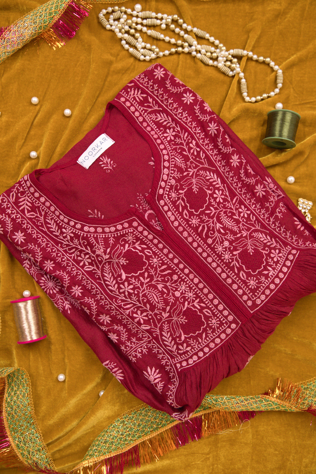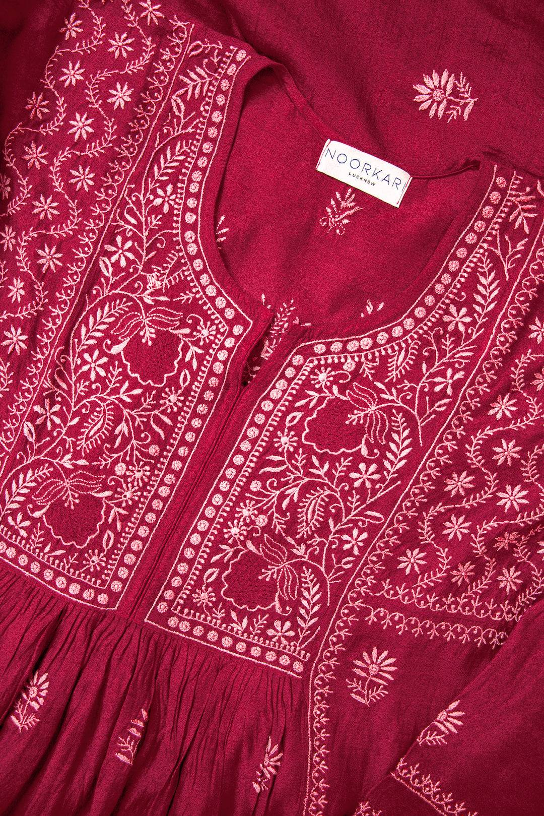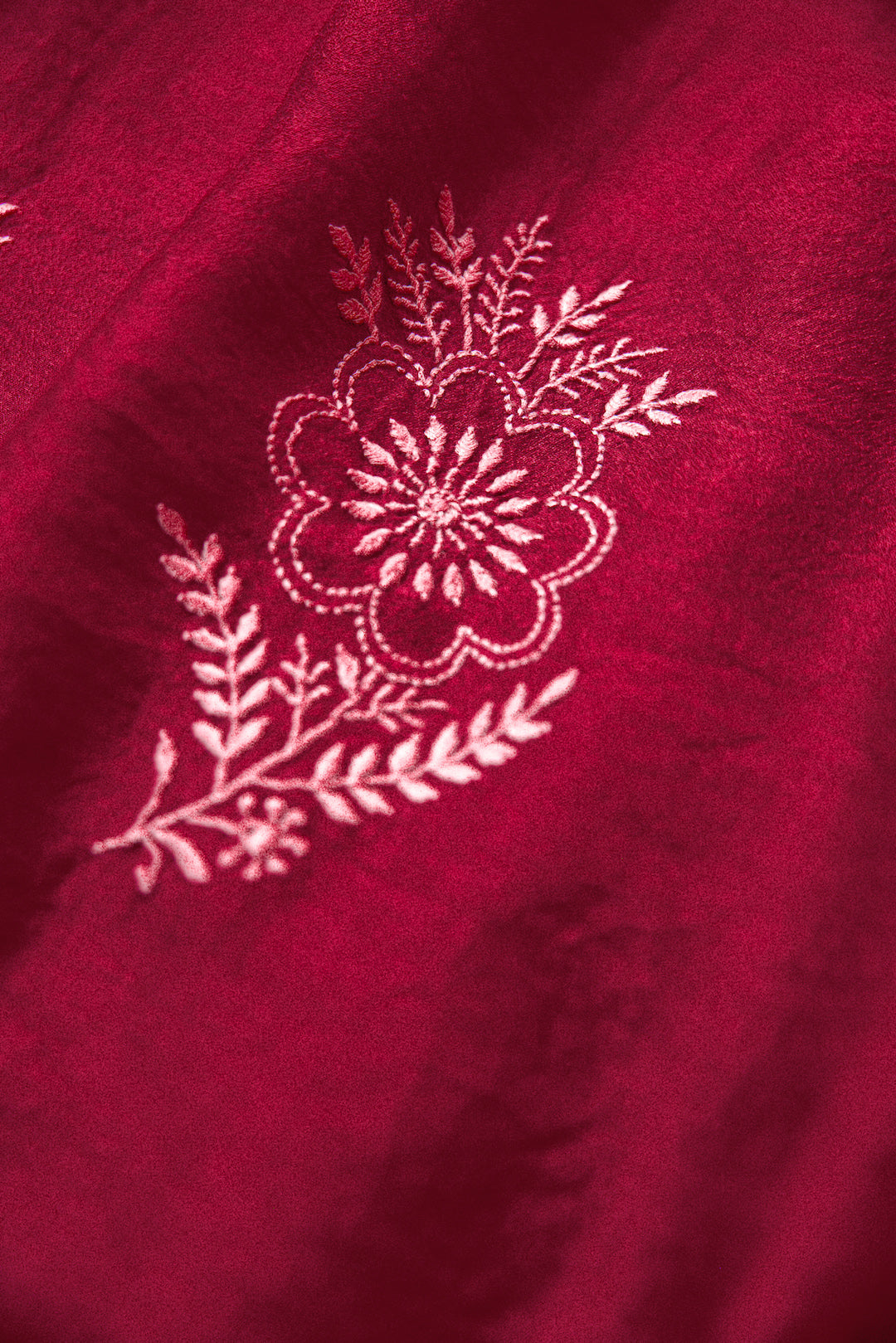 Chikankari is an Art of delicate handwork of Lucknow. It is a handcrafted process where the wooden blocks are manually carved in various designs, and the natural stew for printing is prepared, and printed on the cloth. The chikankari craftsmen then use ten ary of the needlecraft embroidery, and perform the needlework artistically. There are 32 stitches of chikankari broadly classified into Raised stitch, Embossed and Flat stitch.