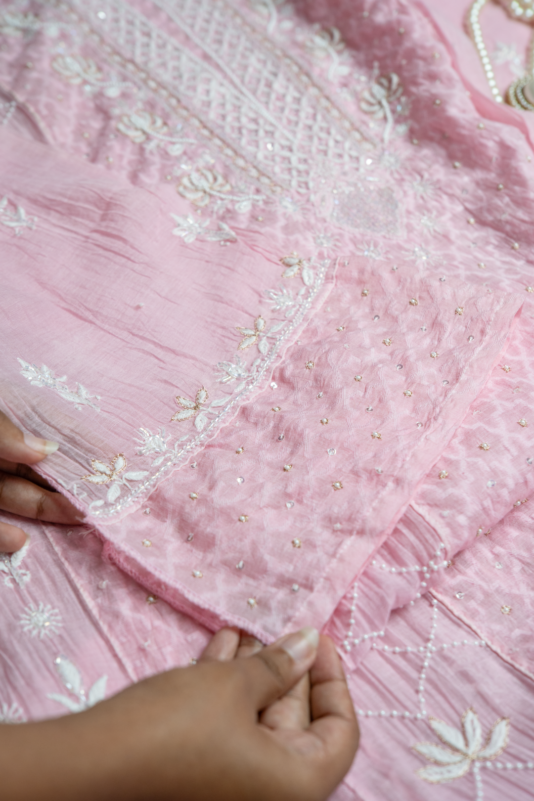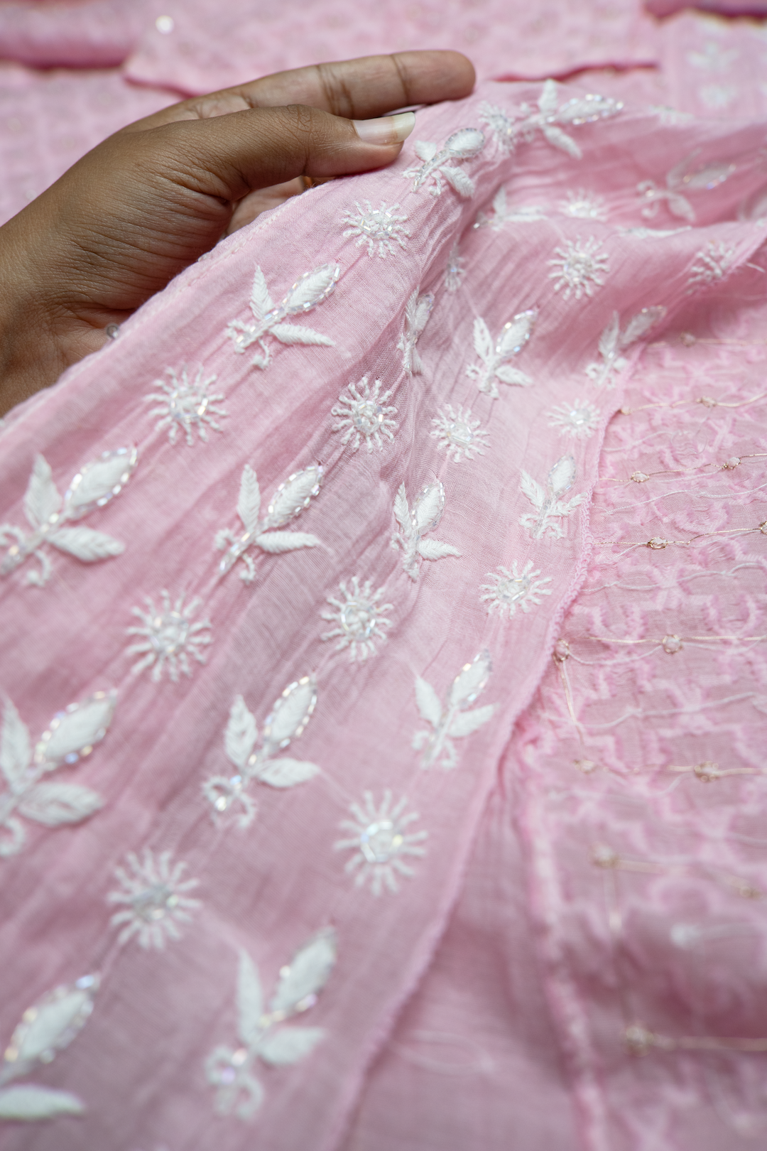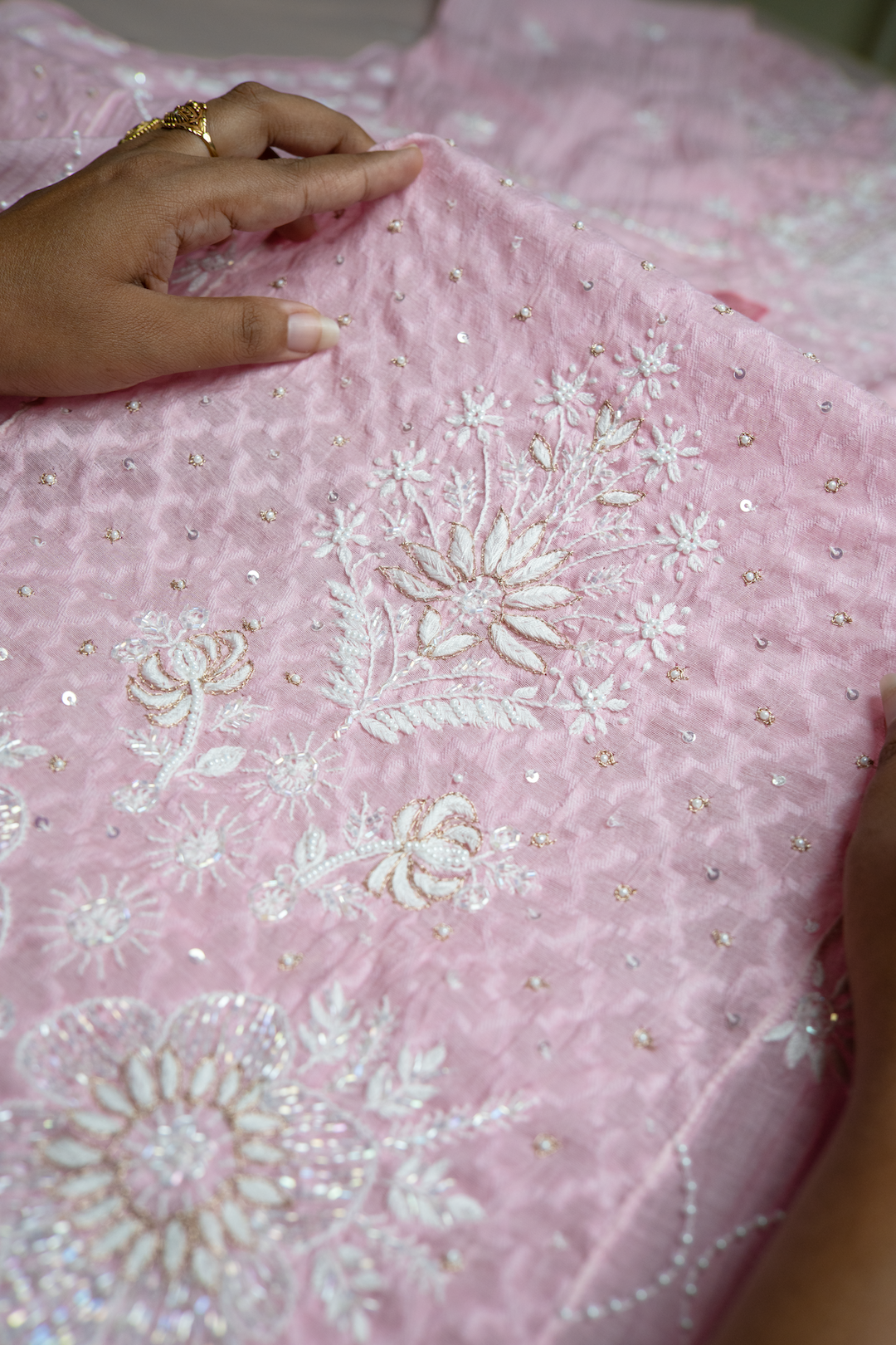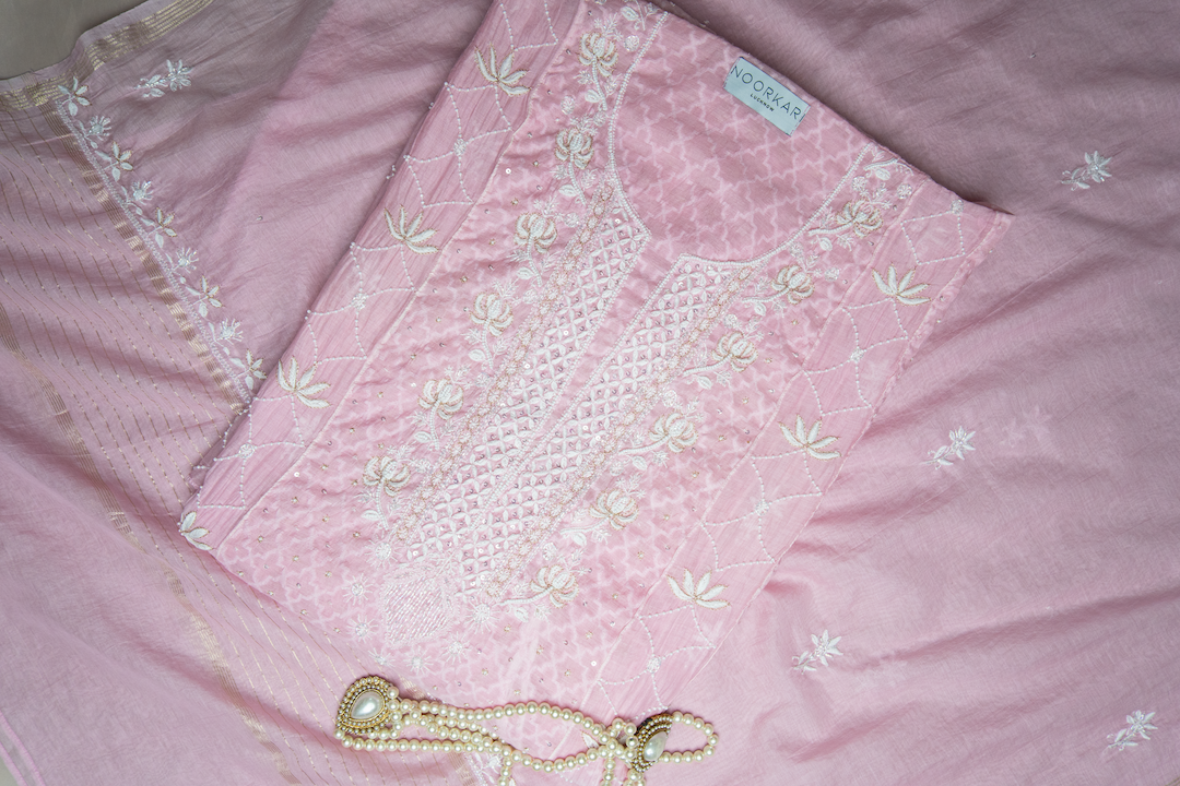 Chikankari is an Art of delicate handwork of Lucknow. It is a handcrafted process where the wooden blocks are manually carved in various designs, and the natural stew for printing is prepared, and printed on the cloth. The chikankari craftsmen then use ten ary of the needlecraft embroidery, and perform the needlework artistically. There are 32 stitches of chikankari broadly classified into Raised stitch, Embossed and Flat stitch.