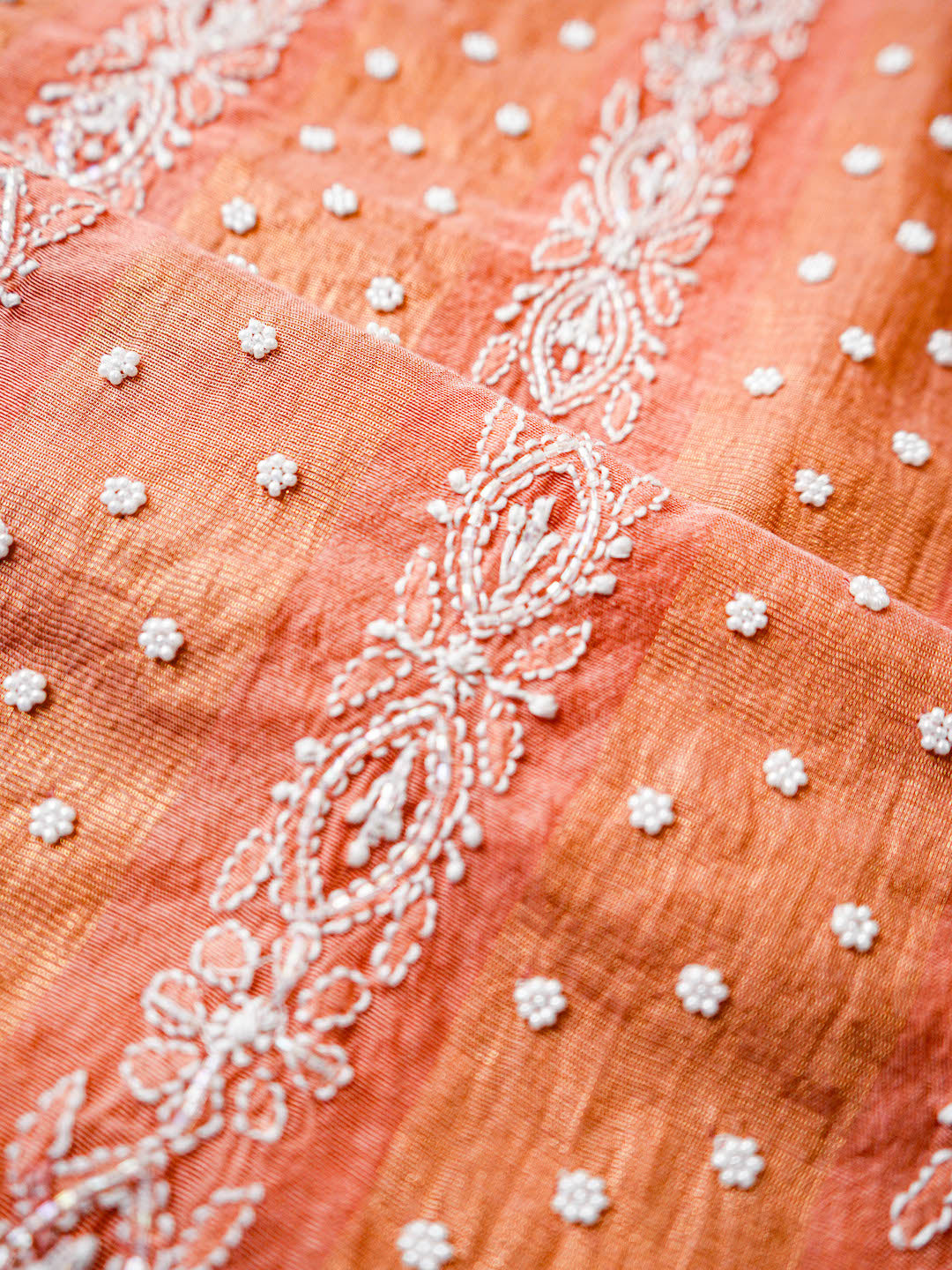 Chikankari is an Art of delicate handwork of Lucknow. It is a handcrafted process where the wooden blocks are manually carved in various designs, and the natural stew for printing is prepared, and printed on the cloth. The chikankari craftsmen then use ten ary of the needlecraft embroidery, and perform the needlework artistically. There are 32 stitches of chikankari broadly classified into Raised stitch, Embossed and Flat stitch.